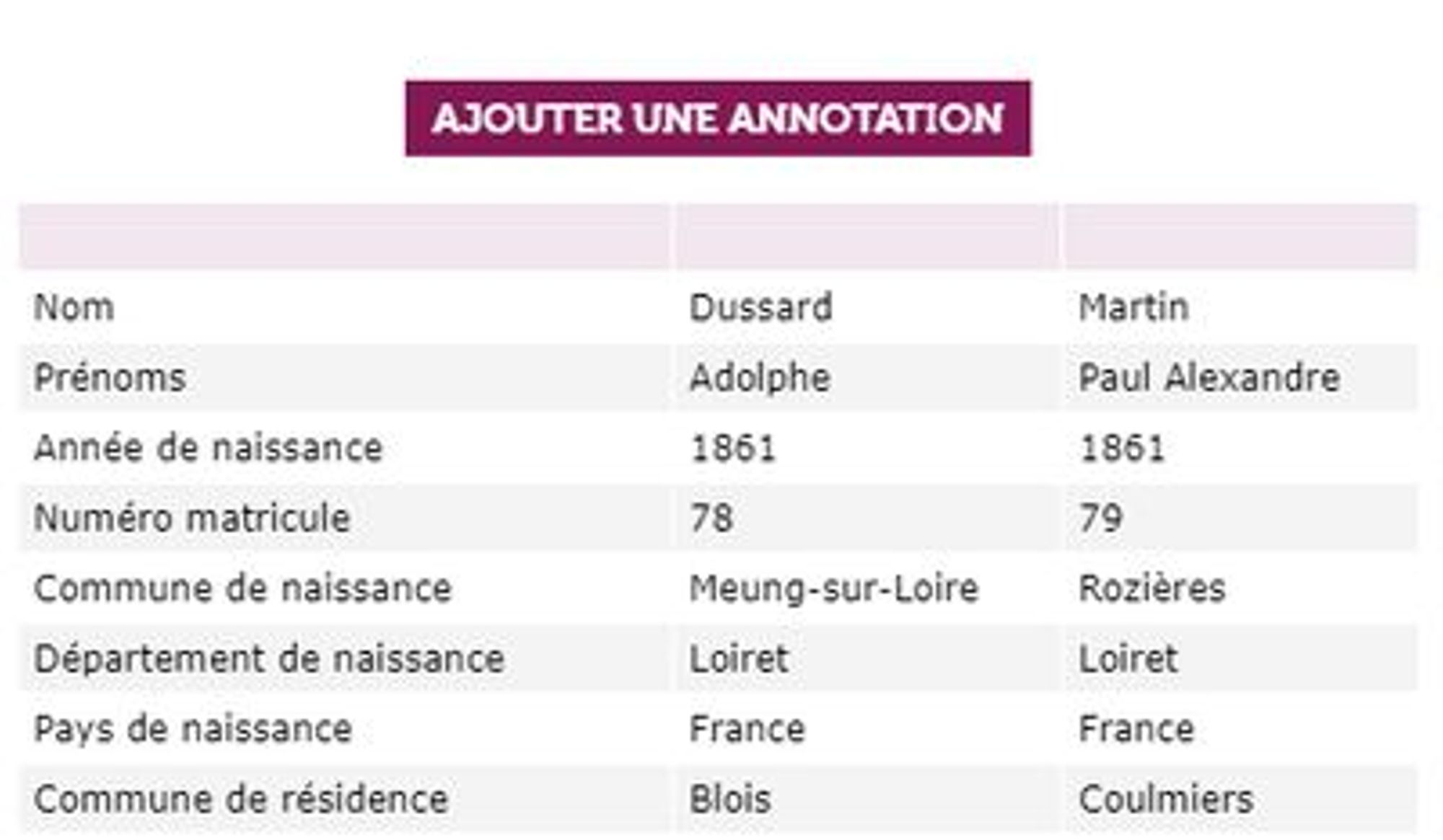 Vous êtes nombreux à participer depuis plus d’un an à l’annotation des registres matricules militaires du Loiret, et nous vous en remercions ! Grâce à vous, plus de 137 000 jeunes Loirétains des XIXe et début XXe siècle peuvent être retrouvés grâce à une recherche sur leur patronyme, et l’on peut lancer des recherches historiques ou statistiques sur des métiers, des communes ou encore des degrés d’instruction. C’est passionnant !