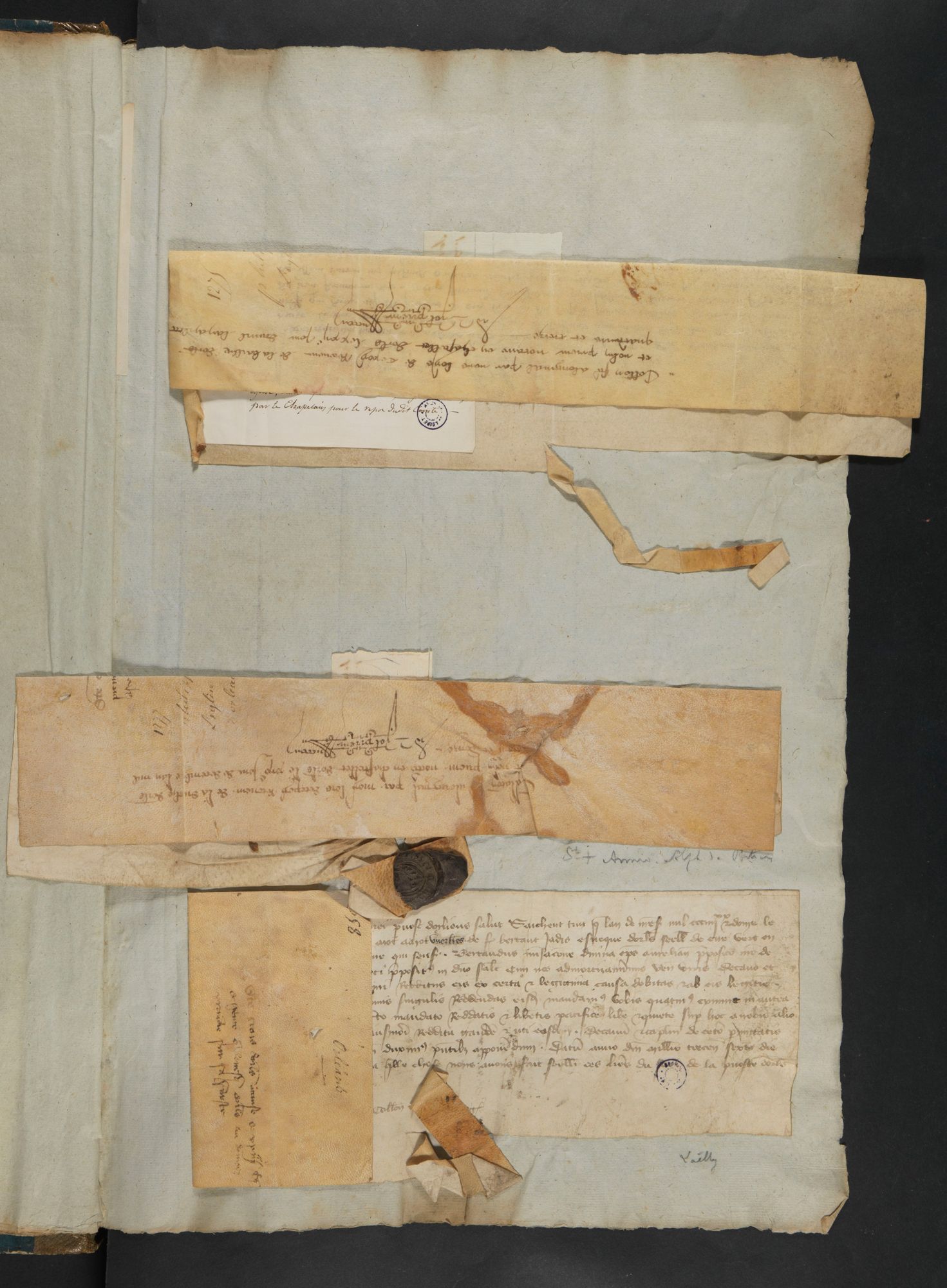 « La complexité provient essentiellement de l’état de conservation des documents. Si le parchemin est un support particulièrement résistant, les pliures qu’il subit entraîne une déformation qu’il est nécessaire de compenser lors de la prise de vue » explique Franck, responsable du laboratoire de photographie. La problématique est encore plus aigüe avec la collection Joursanvault. En effet, les documents de celle-ci ont été collés dans de grands registres sur des feuilles de papier. « Il faut être vigilant à ne pas endommager le support et déplier les parchemins qui prennent alors une plus grande place. Tout est fait pour rendre accessible l’information sans que le lecteur ne se rende compte des opérations que nous avons dû réaliser pour y parvenir » renchérit-il.