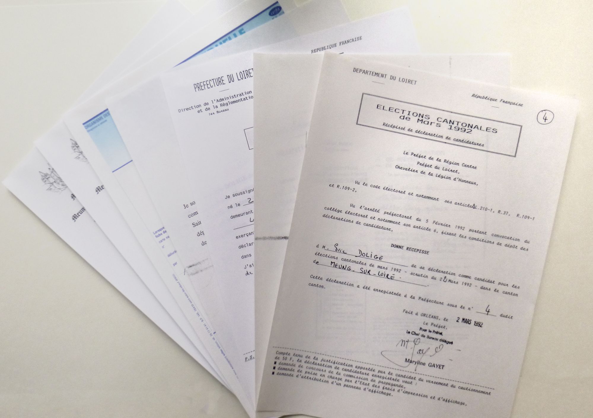 Par ailleurs, on retrouve les documents servant à l’élaboration des candidatures : affiche, bulletin de vote, cahier d'enregistrement des candidats, déclaration de candidature, liste des candidats, profession de foi. Pour les résultats, vous pourrez retrouver le procès-verbal de proclamation des résultats de votre bureau de vote, de votre commune et/ou des autres communes du Loiret. Il y a aussi quelques pièces sur les dépenses de campagne ainsi que quelques contentieux soulevés par les luttes électorales.
