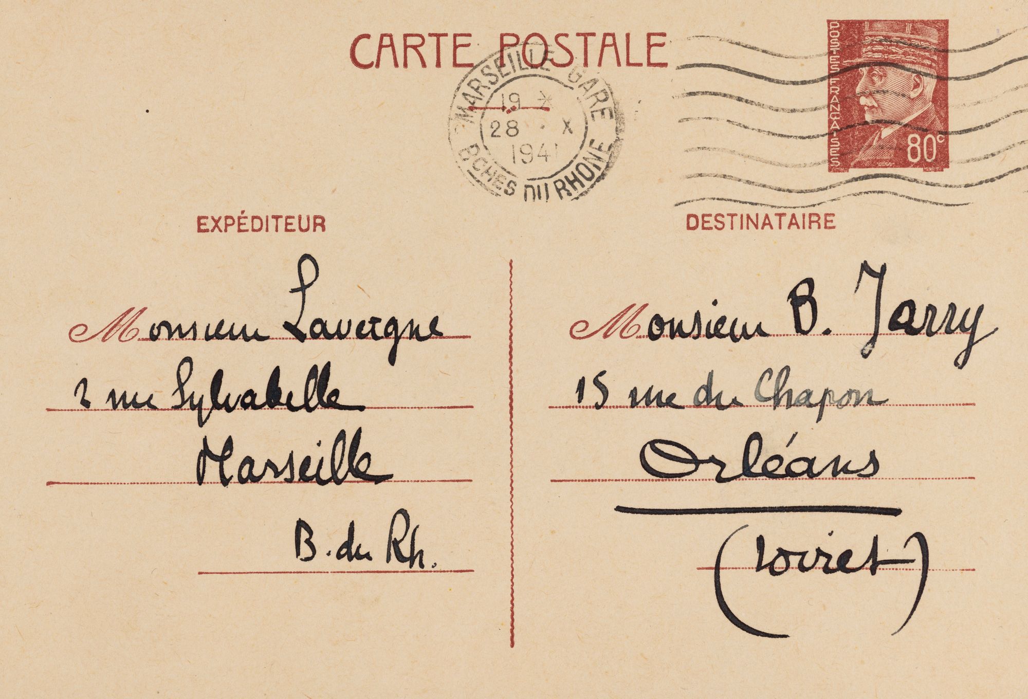Carte postale d’un chartiste à un autre, Géraud Lavergne écrit à Bernard Jarry en évoquant notamment l'incendie du 18 juin 1940 qui a ravagé les Archives départementales du Loiret.