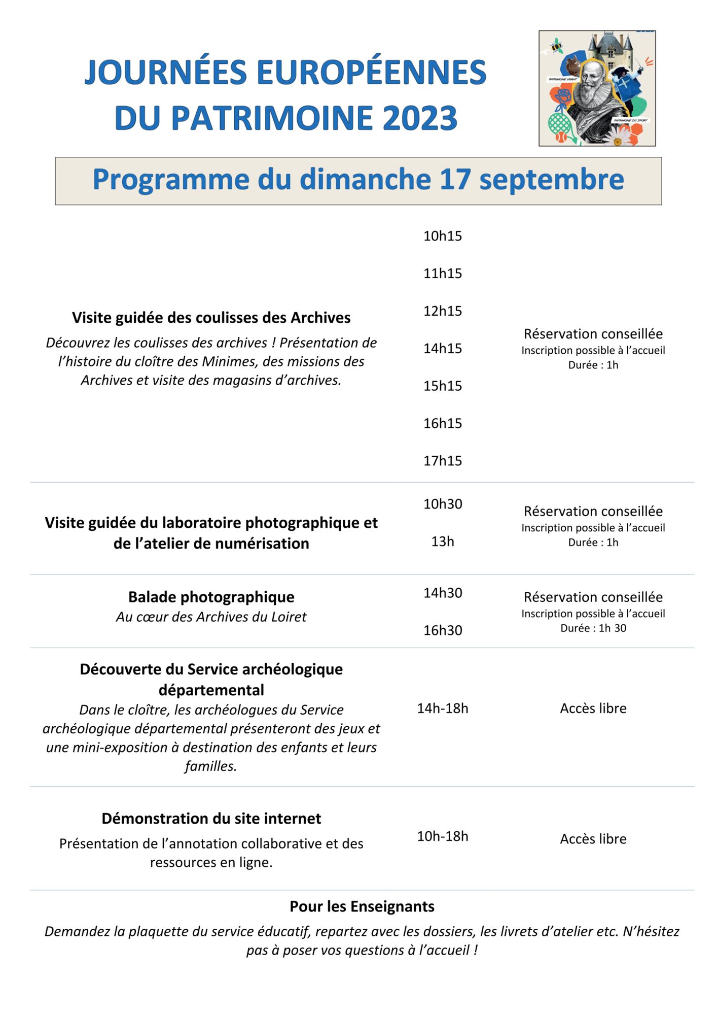 - Visite guidée des coulisses des Archives départementales du Loiret à 10h15, 11h15, 12h15, 14h15, 15h15, 16h15 et 17h15 (réservation conseillée, durée : 1h)