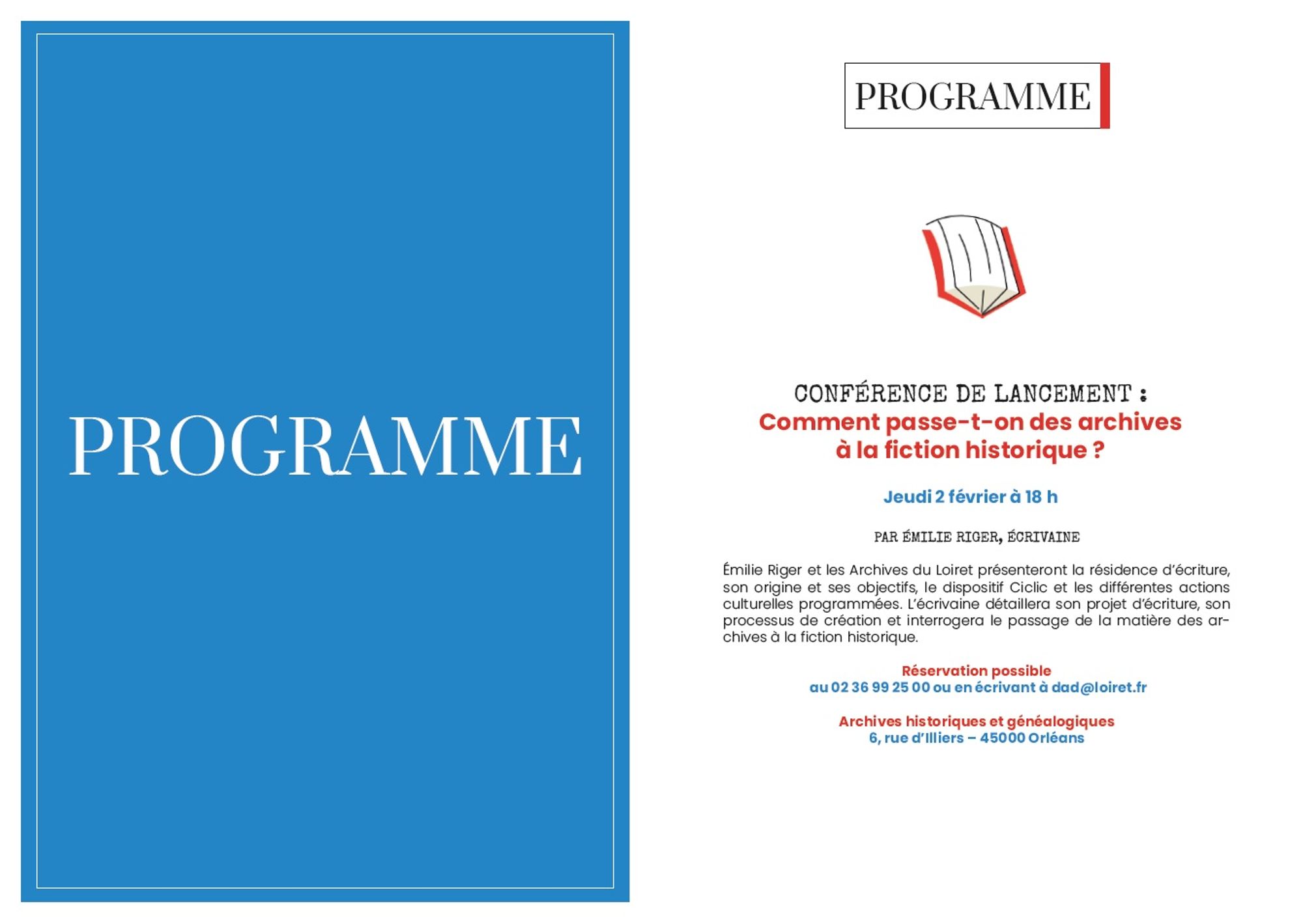 Les Archives du Loiret et l’écrivaine Emilie Riger s’associent en 2023 pour une résidence d’écriture. Pendant 7 mois, Emilie Riger bénéficiera d’une bourse de résidence pour mener à bien son projet d’écriture et organiser des animations autour de son œuvre. Le projet culturel, élaboré conjointement par les Archives du Loiret et l’écrivaine, a l’ambition de valoriser le patrimoine à travers une création contemporaine.