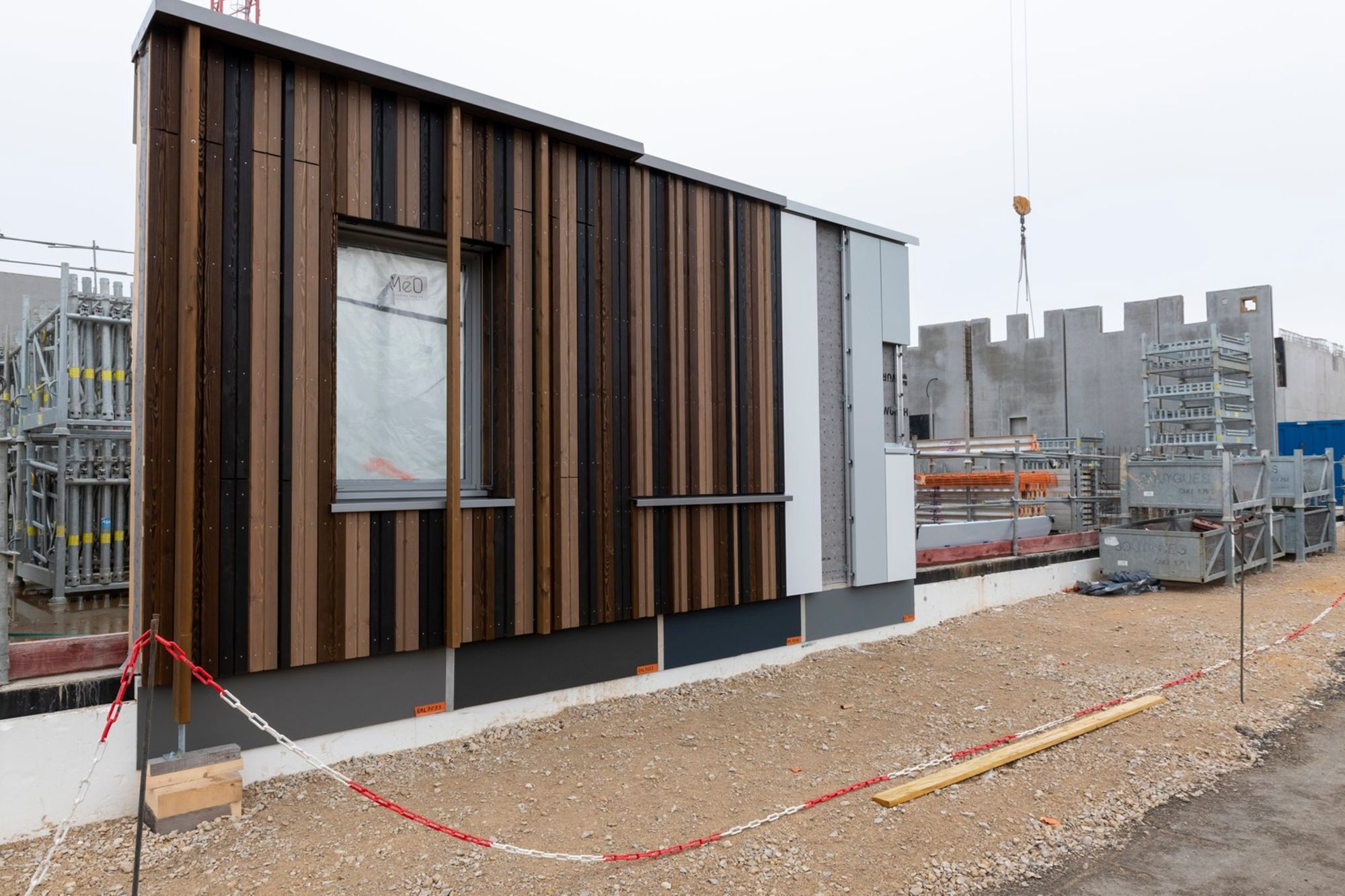 Les travaux avancent : les murs de la zone des publics au rez-de-chaussée sont déjà presque tous en place, le coulage de la dalle au sol sera bientôt achevé, et on peut apercevoir le rendu des futurs revêtements extérieurs.