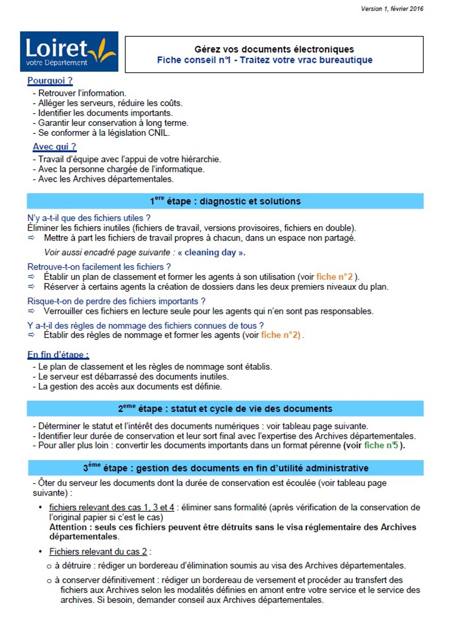 Cinq fiches pratiques ont été réalisées par les services d’archives départementales de la région Centre-Val de Loire en février 2016 dans le but de répondre aux questions les plus fréquentes en matière de gestion des documents électroniques. Vous souhaitez optimiser votre gestion documentaire numérique, numériser des originaux papier ? Consultez nos fiches pratiques !