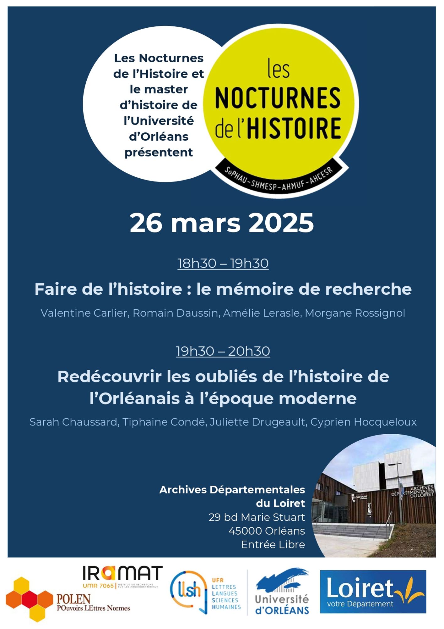 Dans le cadre des "Nocturnes de l'Histoire", le Master d'histoire de l'Université d'Orléans vous propose deux tables rondes le mercredi 26 mars 2025 de 18h30 à 20h30.