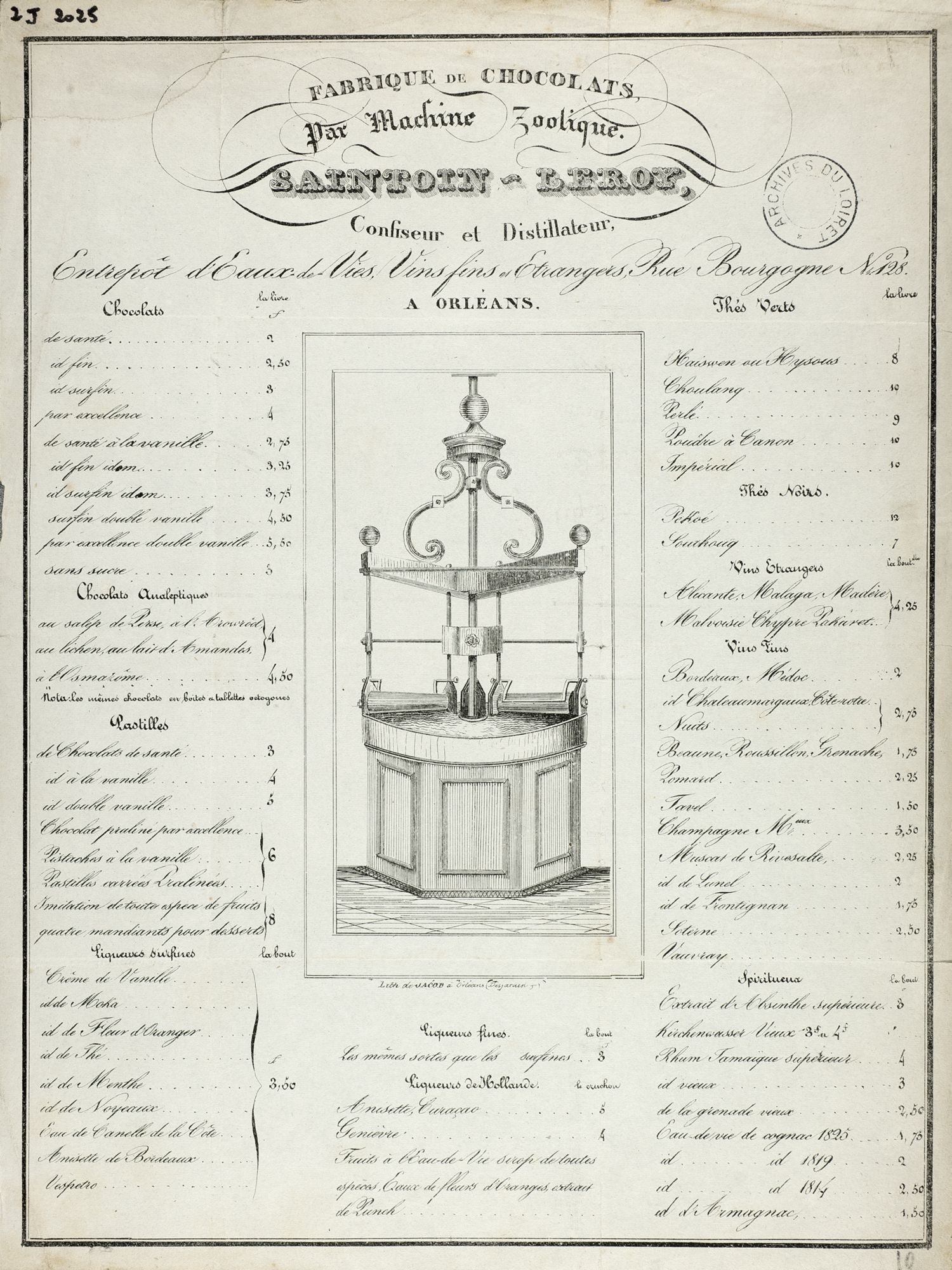 Une fois récolté, le cacao est acheminé en France par bateau, et arrive jusqu’à Orléans par la Loire. Fondée en 1760 par deux frères, la maison Saintoin est une des premières entreprises du Loiret à s’intéresser à cette denrée. À l’origine fabricante de vinaigres, l’entreprise diversifie son activité et se met à faire du chocolat. Installée rue de Bourgogne et rue Royale, elle utilise une machine dite zoolique (ce qui signifie littéralement qu’elle fonctionne en manège à l’aide d’animaux) pour confectionner des tablettes de chocolats dites de santé (nature ou à la vanille) et analeptique (au lichen ou lait d’amande). Elle en propose même à sa clientèle sous forme de pastille !