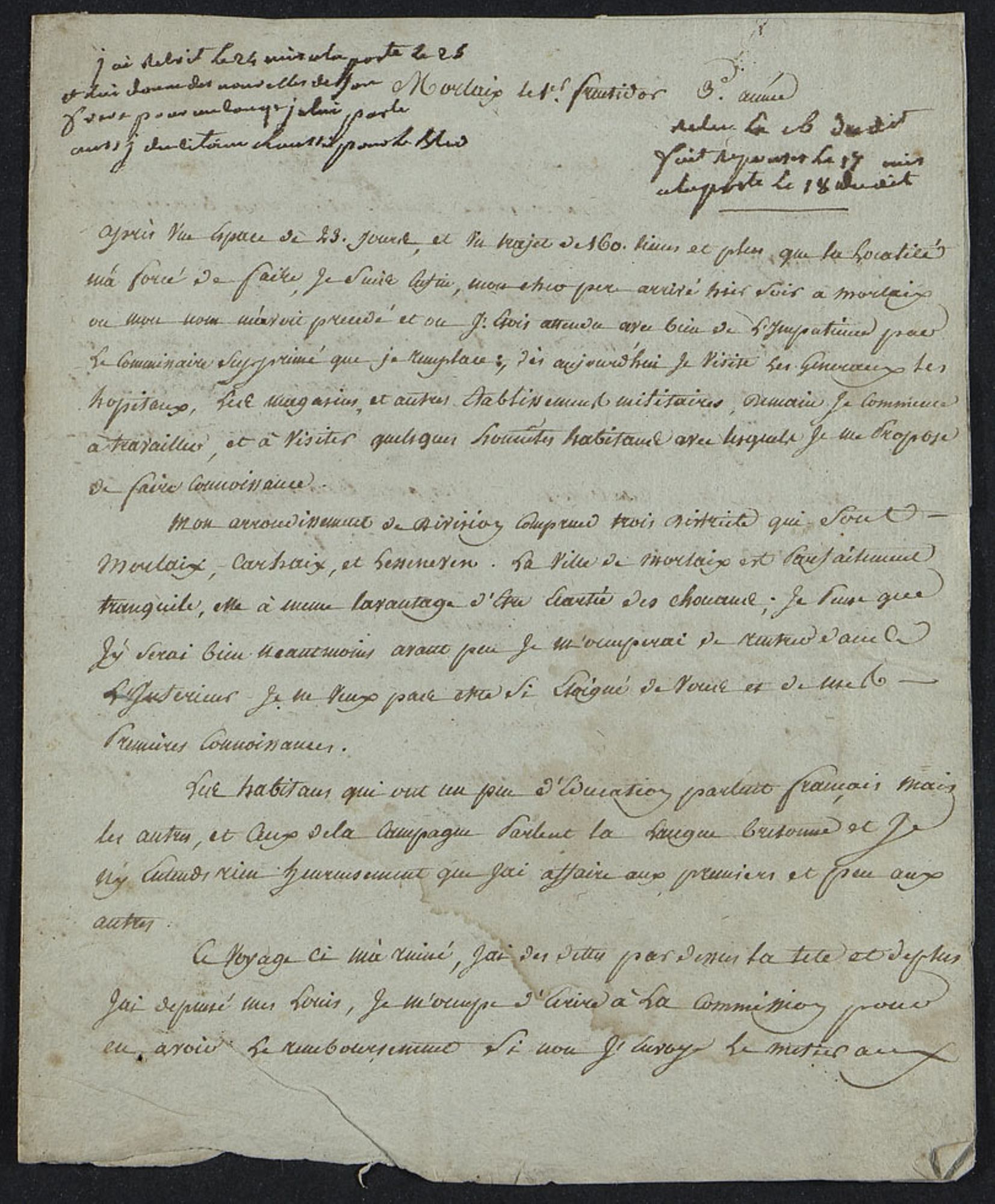 Jean-Hilaire Barchou informe son père de sa récente prise de poste en tant que commissaire de la guerre, donc chargé de l’administration et de l’entretien des armées, à la résidence de Morlaix. Après avoir été en poste à Cholet, au plus près de la zone insurgée des Vendéens, il reconnaît la tranquillité de cette ville du Finistère qui a l’avantage d’être éloignée des Chouans. Ces derniers opéraient approximativement dans un rectangle délimité par Saint-Brieuc et Lorient à l’Ouest, Alençon, le Mans et La Flèche à l’Est.