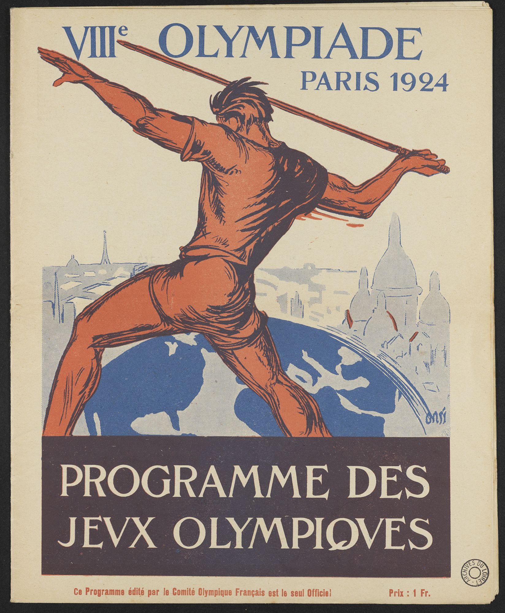 Les Archives départementales conservent un programme des JO de 1924, reproduisant la seconde affiche officielle. Elle montre un lanceur de javelot au-dessus de la capitale française et du monde.
