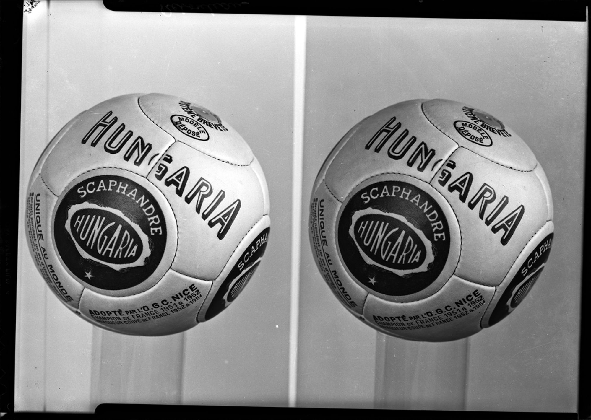 Modèle de ballon de football « scaphandre » de la marque Hungaria, photographie, [1950-1960].