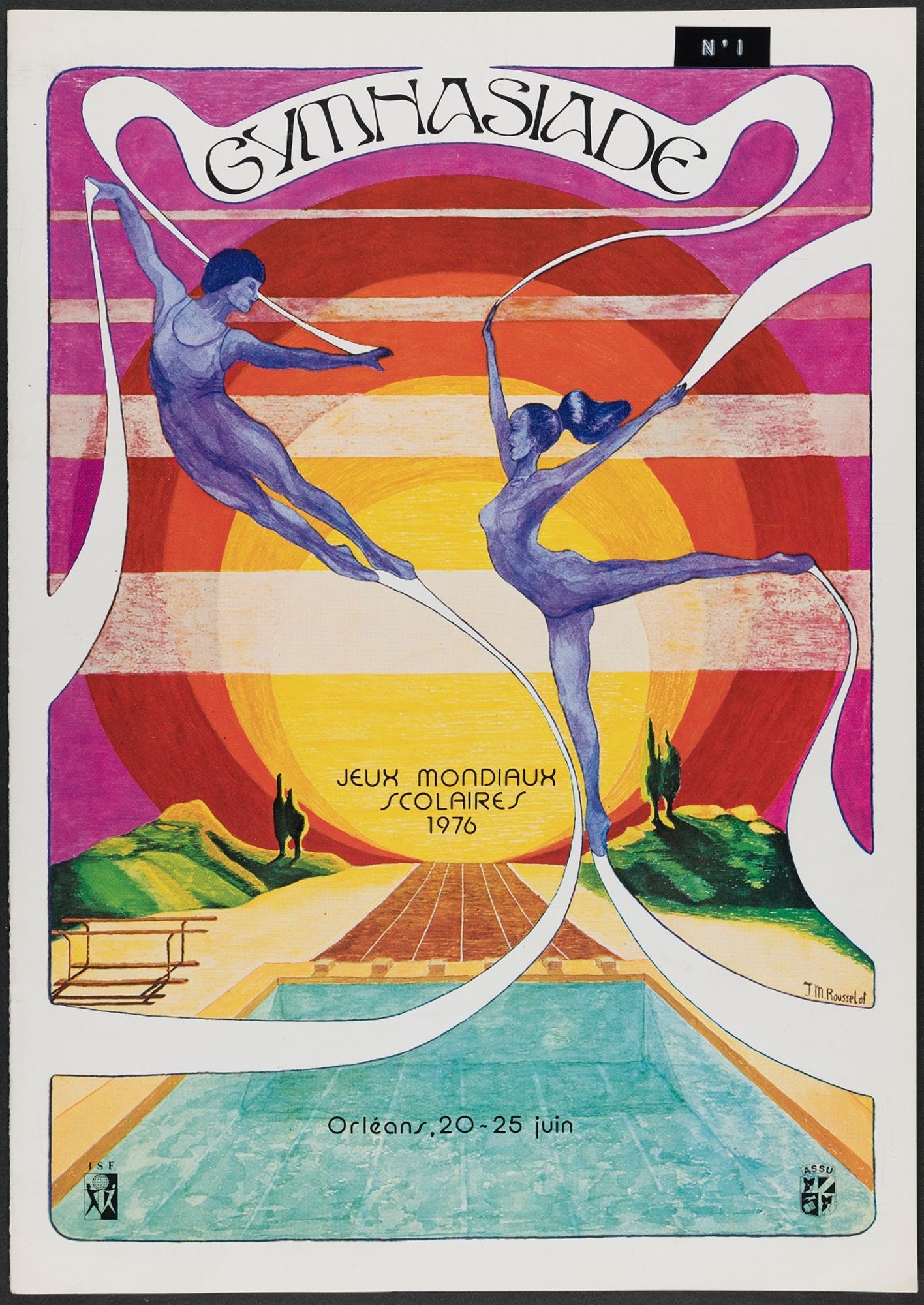 Le principe d’identification d’un événement sportif par une affiche officielle est étendu à d’autres compétitions de grande ampleur. C’est le cas des Gymnasiades, dits également « Jeux olympiques du sport scolaire ». Multidisciplinaires, ces jeux sont réservés aux lycéens et lycéennes de moins de 18 ans et organisés tous les deux ans depuis 1974. La deuxième édition des Gymnasiades s’est tenue à Orléans du 20 au 25 juin 1976. L’affiche dessinée pour l’occasion met en scène deux athlètes flottant au-dessus d’une piscine en maniant des rubans de gymnastique rythmique.