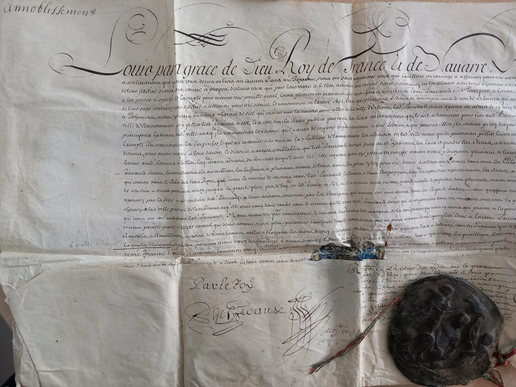 Lettres patentes d’anoblissement d’Étienne Lauréault, avec un sceau de Louis XIV, 1677. Archives départementales du Loiret, 35 J 143.