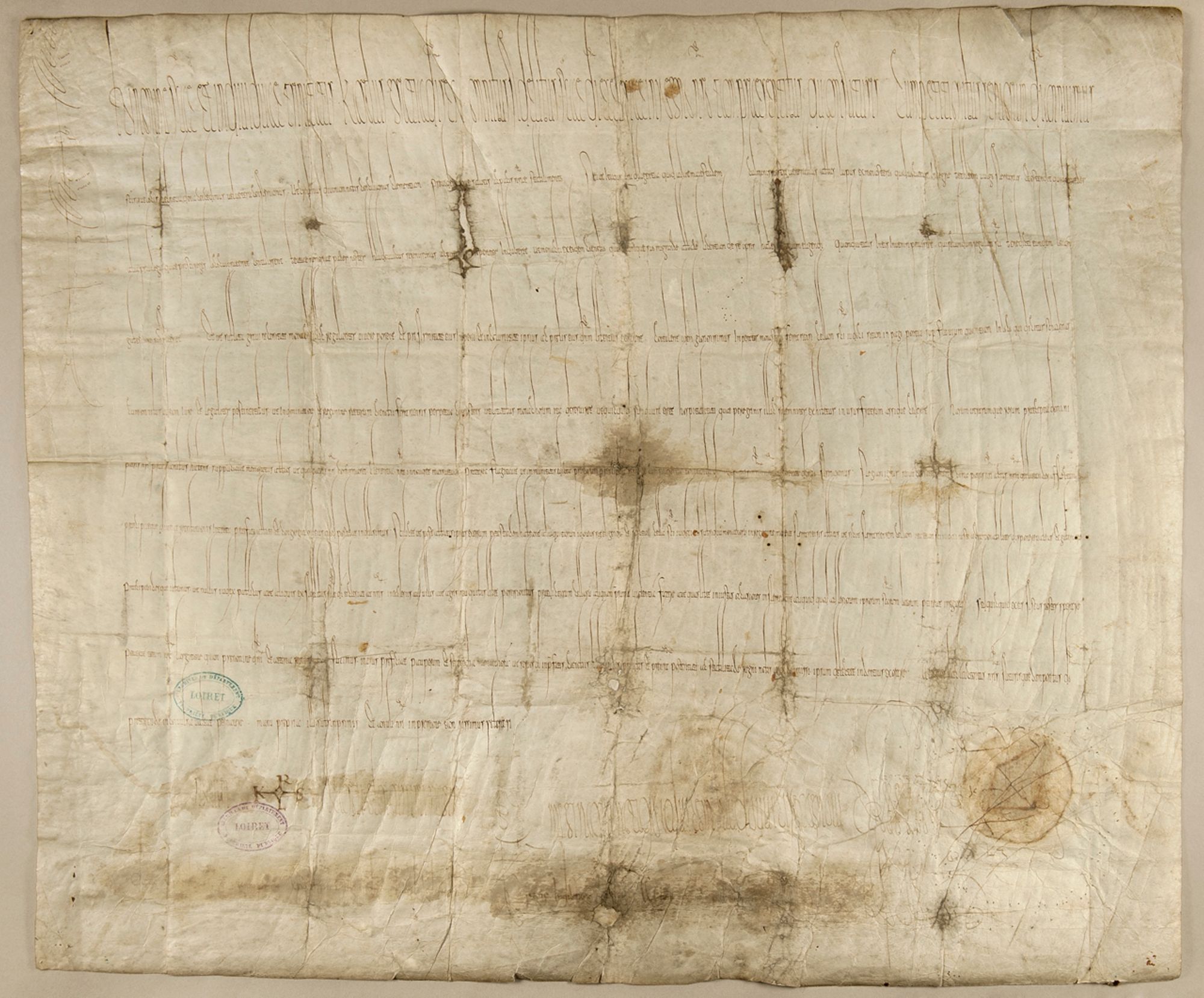 Le plus ancien document conservé aux Archives départementales du Loiret est une charte de Charles le Chauve en faveur de l'abbaye de Ferrières, donnée à Attigny le 10 mai 841. A peine devenu roi, il confirme aux moines la liberté d'élire leur abbé, le privilège d'immunité et les donations faites par son père Louis le Pieux. L'écriture - la minuscule diplomatique - utilisée par la chancellerie royale carolingienne, se caractérise par sa netteté et son élégance. Elle tranche avec celle, grossière, de l'époque mérovingienne. Le sceau qui était plaqué sur incision cruciforme dans le parchemin, a disparu. On notera le monogramme, institué par Charlemagne : dessin composé des lettres du nom du souverain K[a]R[o]L[u]S, bâti sur un losange central.