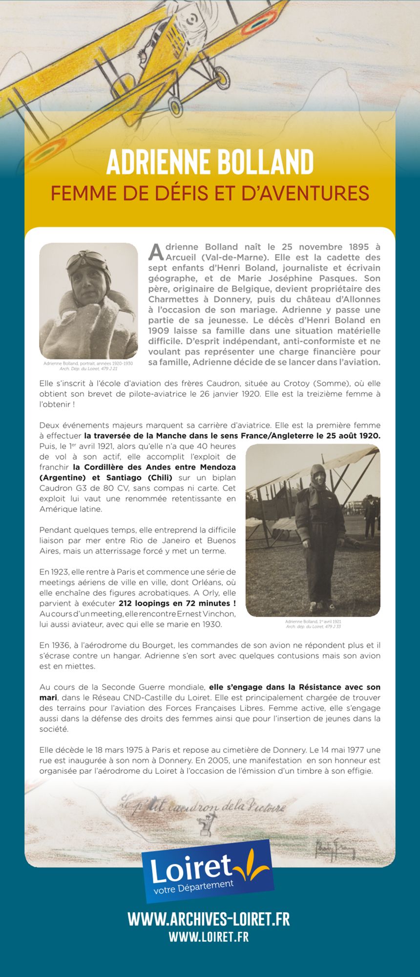 Vous pouvez également lire l'article "Les 100 ans d'Adrienne Bolland, aviatrice loirétaine d’exception !" sur le site loiret.fr.