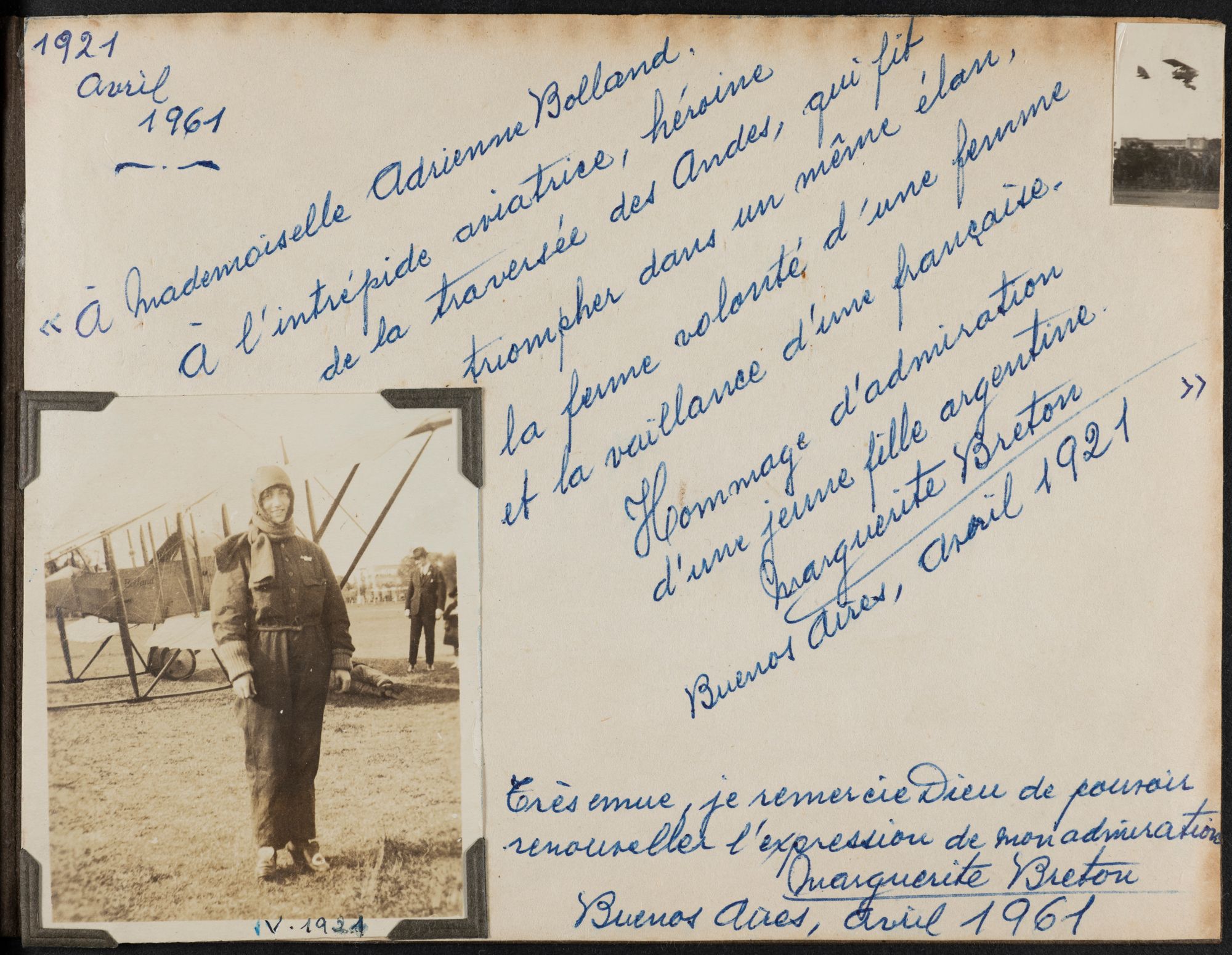 1 Le patronyme d’Adrienne Bolland prend deux « L » tandis que celui de son père n’en prend qu’un. Il s'agit possiblement d'une erreur d'état civil. Vous pouvez voir sur l'acte de mariage d'Henri Boland avec Marie Pasques que la signature de l'époux contient un "L" tandis que le nom sur l'acte en comporte deux. En ce qui concerne Adrienne, il se dit également qu’il fallait deux « L » pour voler en avion. C’est en tout cas un jeu de mot qui était et est toujours utilisé pour justifier cette erreur orthographique !