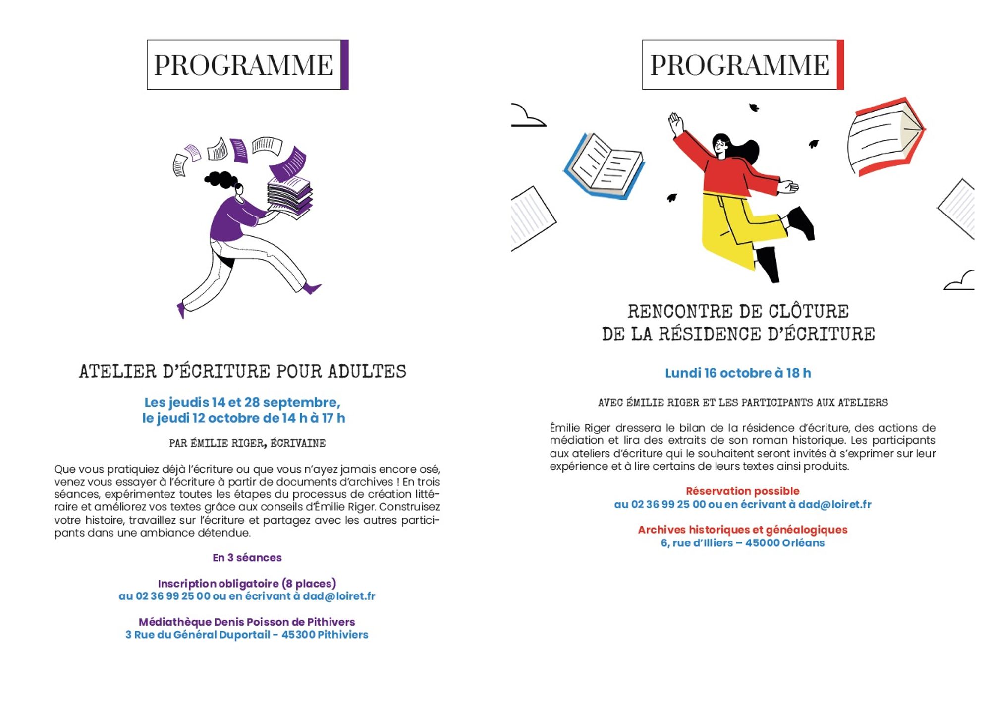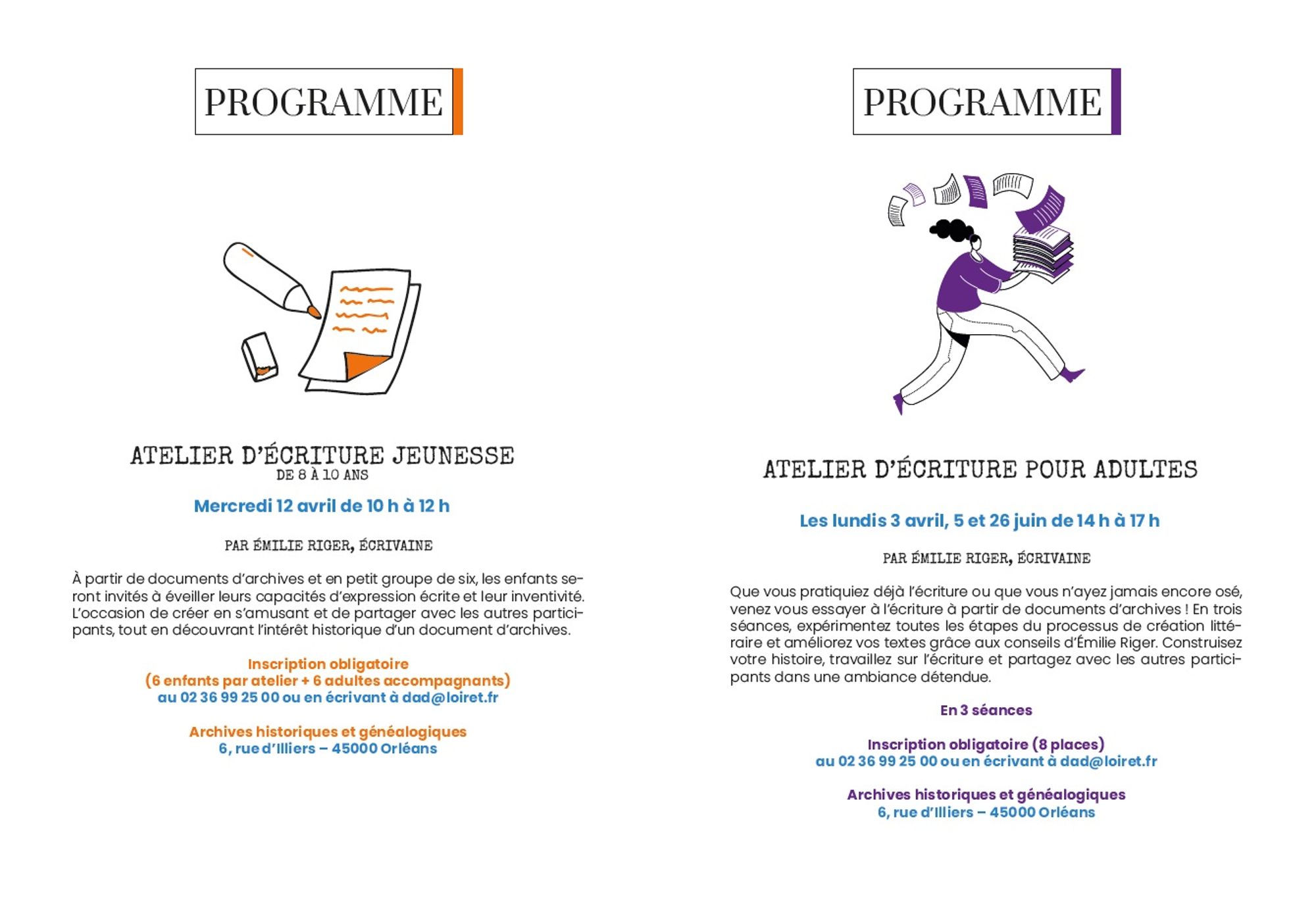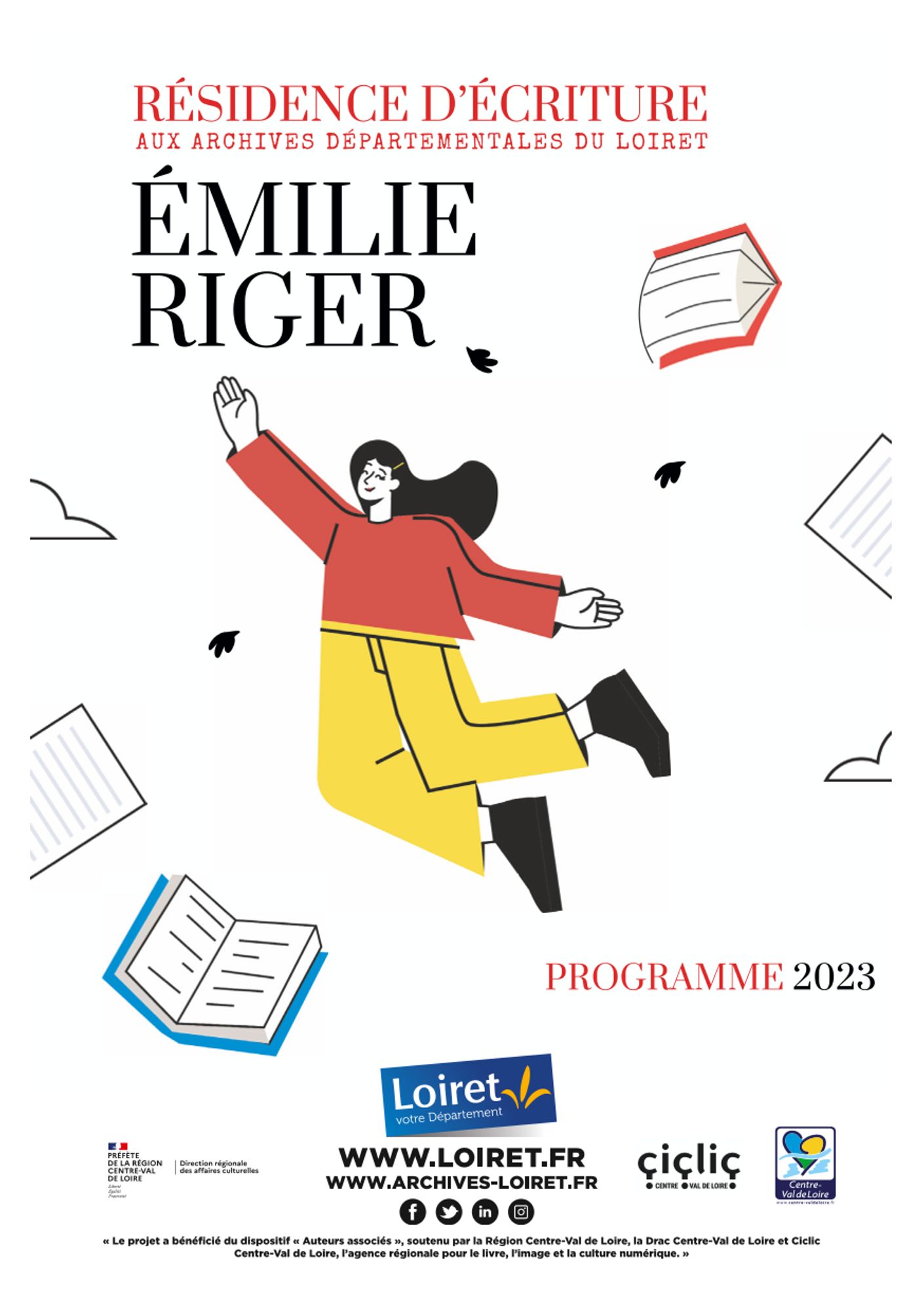 Les Archives du Loiret et l’écrivaine Emilie Riger s’associent en 2023 pour une résidence d’écriture. Pendant 7 mois, Emilie Riger bénéficiera d’une bourse de résidence pour mener à bien son projet d’écriture et organiser des animations autour de son œuvre. Le projet culturel, élaboré conjointement par les Archives du Loiret et l’écrivaine, a l’ambition de valoriser le patrimoine à travers une création contemporaine.