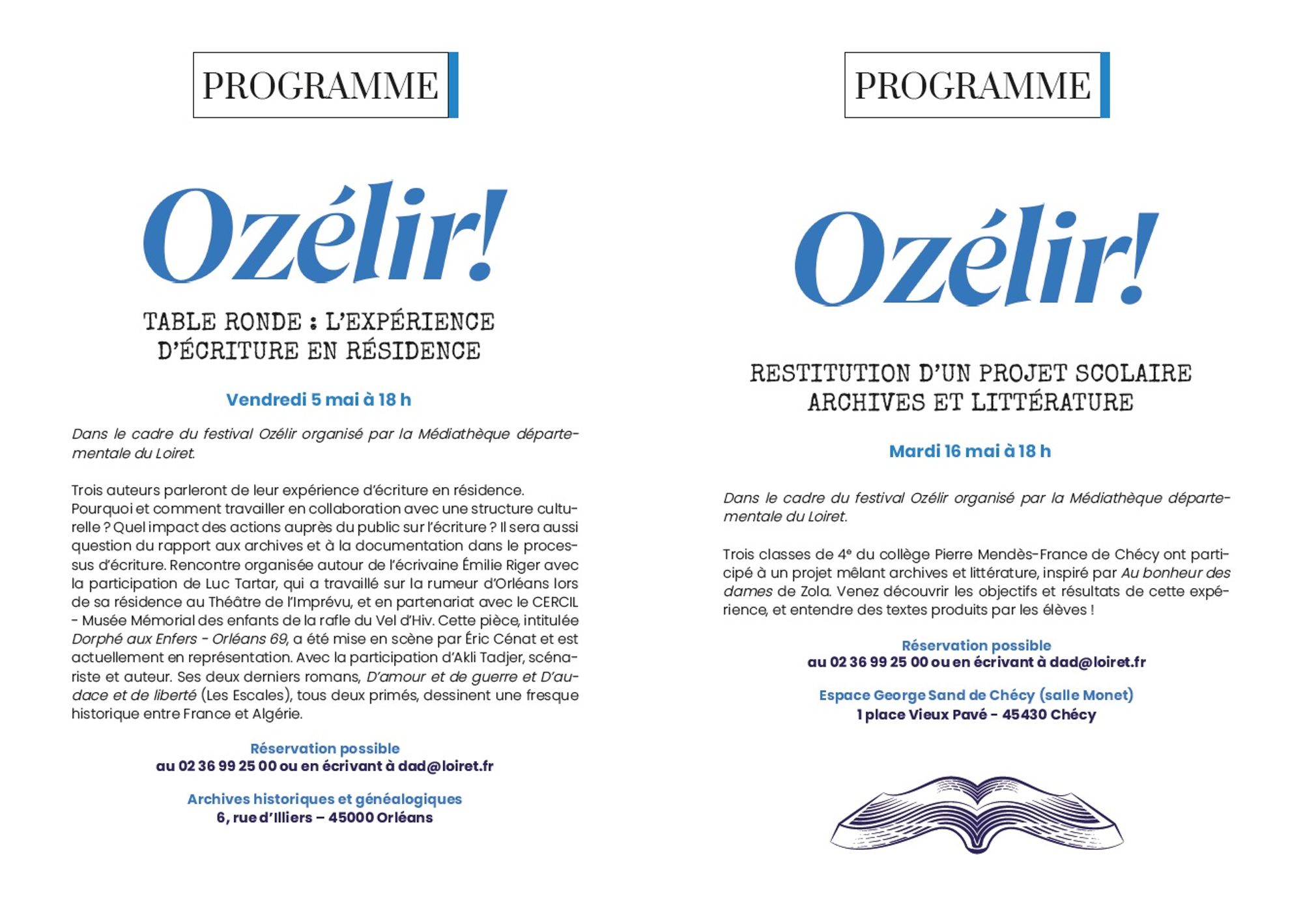 En plus des actions tout public, un travail avec le public scolaire sera mené avec trois classes de 4e du collège de Chécy et restitué en partenariat avec la Médiathèque départementale du Loiret pendant le festival Ozélir, en mai. Dans le cadre de ce même festival, un atelier sera proposé à des femmes détenues de la prison de Saran.