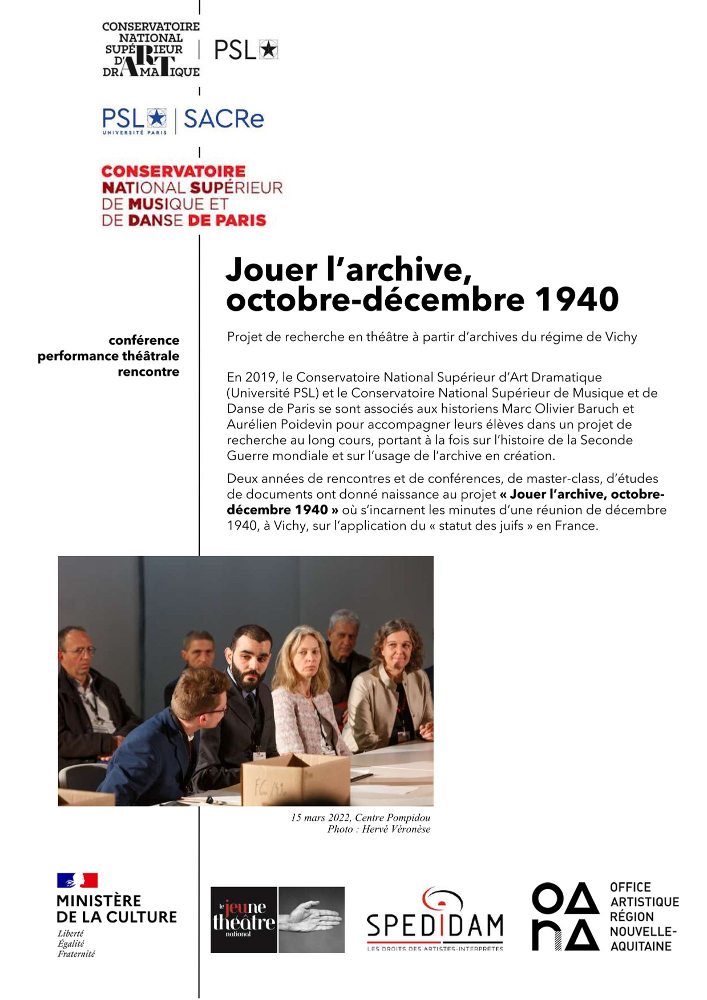 En 2019, le Conservatoire National Supérieur d’Art Dramatique (Université PSL) et le Conservatoire National Supérieur de la Musique et de la Danse de Paris se sont associés aux historiens Marc Olivier Baruch et Aurélien Poidevin pour accompagner leurs élèves dans un projet de recherche au long cours, portant à la fois sur l’histoire de la Seconde Guerre Mondiale et sur l’usage de l’archive en création. Deux années de rencontres et de conférences, de master-class, d’études de documents ont donnée naissance au projet “Jouer l’archive, octobre-décembre 1940” .