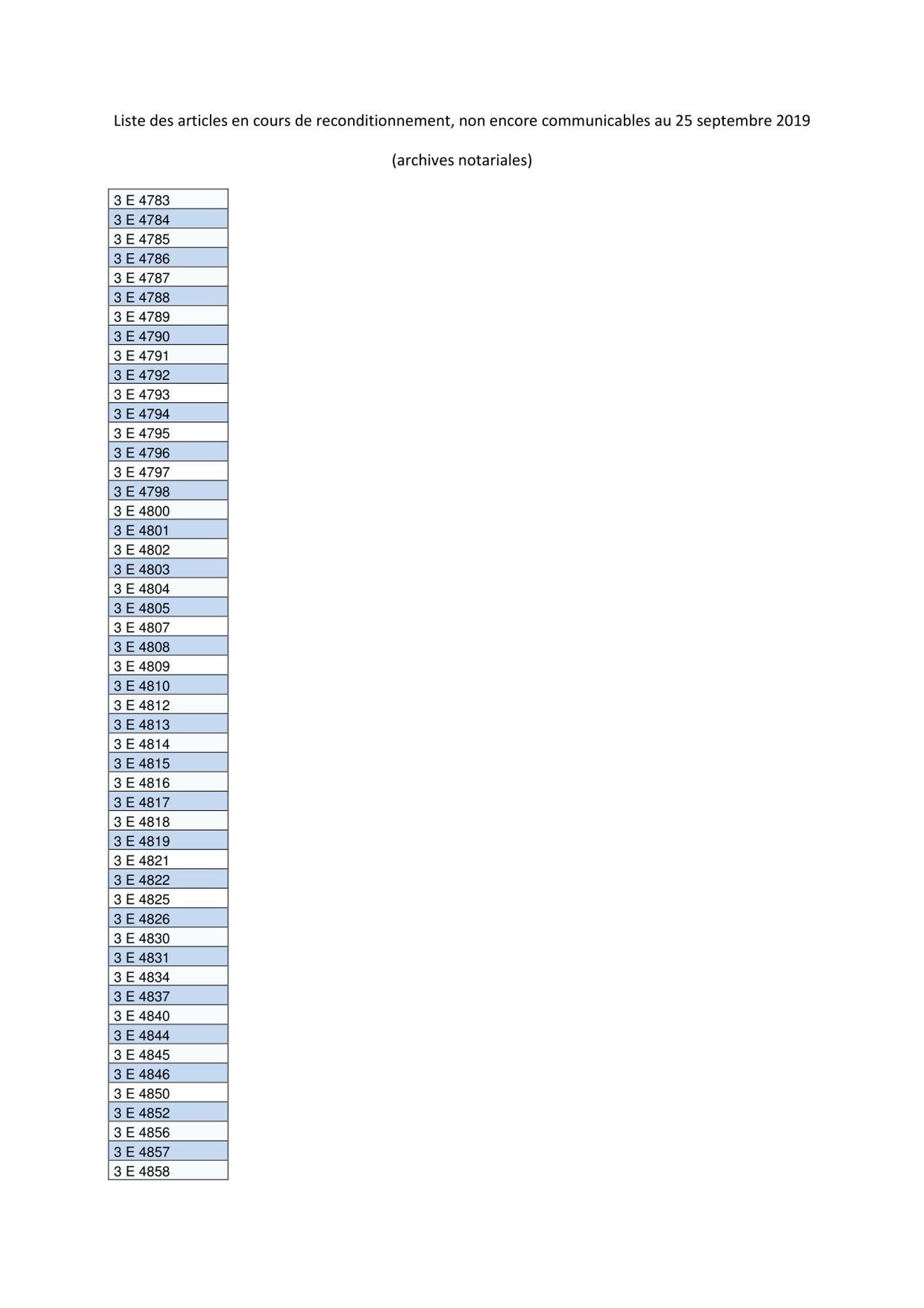 À compter du 25 septembre 2019, les documents dont la cote est comprise entre 3E 4782 et 3E 11999 seront temporairement incommunicables, ainsi que quelques liasses hors format dont voici la liste: