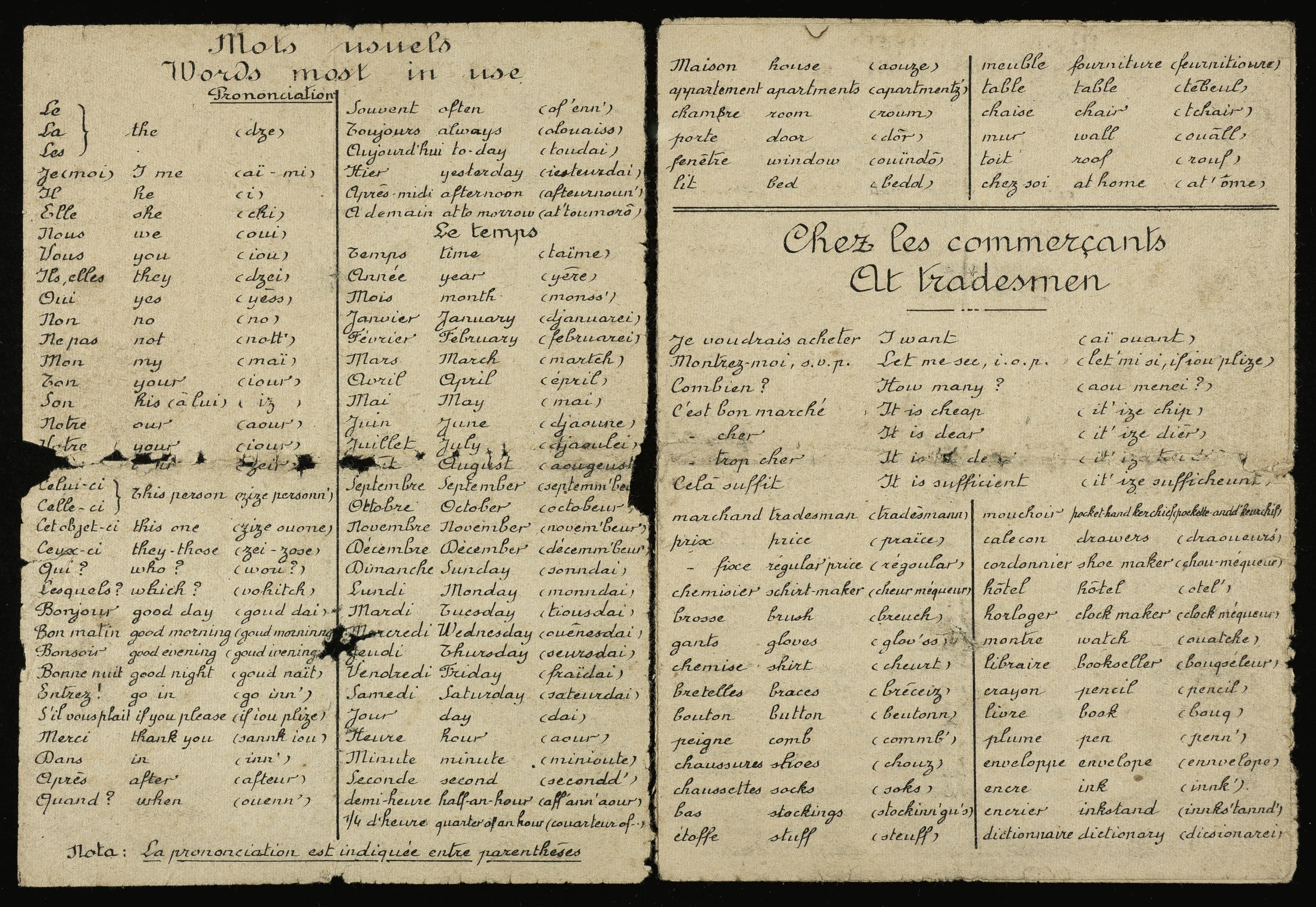 Né le 7 octobre 1895 à Grigneville, Emile Lemaire servit entre 1914 et 1918 aux 82e et 112e régiments d'infanterie. Il fut blessé trois fois en juillet 1915, avril 1917 et octobre 1918. Parmi ses souvenirs de la Première Guerre mondiale, il a conservé des guides linguistiques, un pour l’allemand et un pour l’anglais. Si le premier se justifiait par le besoin de décrypter les messages ou conversations de l’ennemi, voire anticipait une capture (ce fut le cas pour plus d’un demi-million de Français), le second paraît clairement lié à la présence des troupes alliées anglophones sur le territoire français. Le libraire orléanais Maurice Rouam saisit cette opportunité pour publier un lexique imprimé certes, mais dont les caractères ont été écrits à la main. Cette forme très artisanale dénote vraisemblablement la volonté de gagner du temps ou le manque de moyens. Bien que non daté, ce document est vraisemblablement lié à la présence des troupes américaines à partir de 1917, lesquelles sont restées plusieurs mois à l’arrière pour se préparer au combat.
