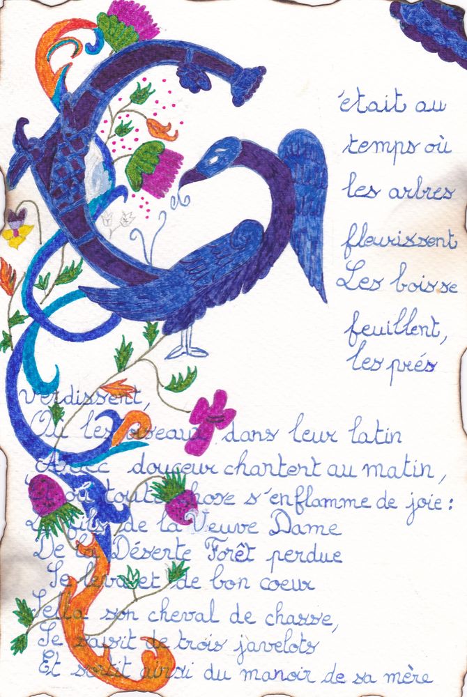 A la suite de l'atelier, les élèves recopient un poème extrait de "Perceval ou le Conte du Graal" de Chrétien de Troyes, en s'essayant à l'écriture médiévale. Voir les travaux :