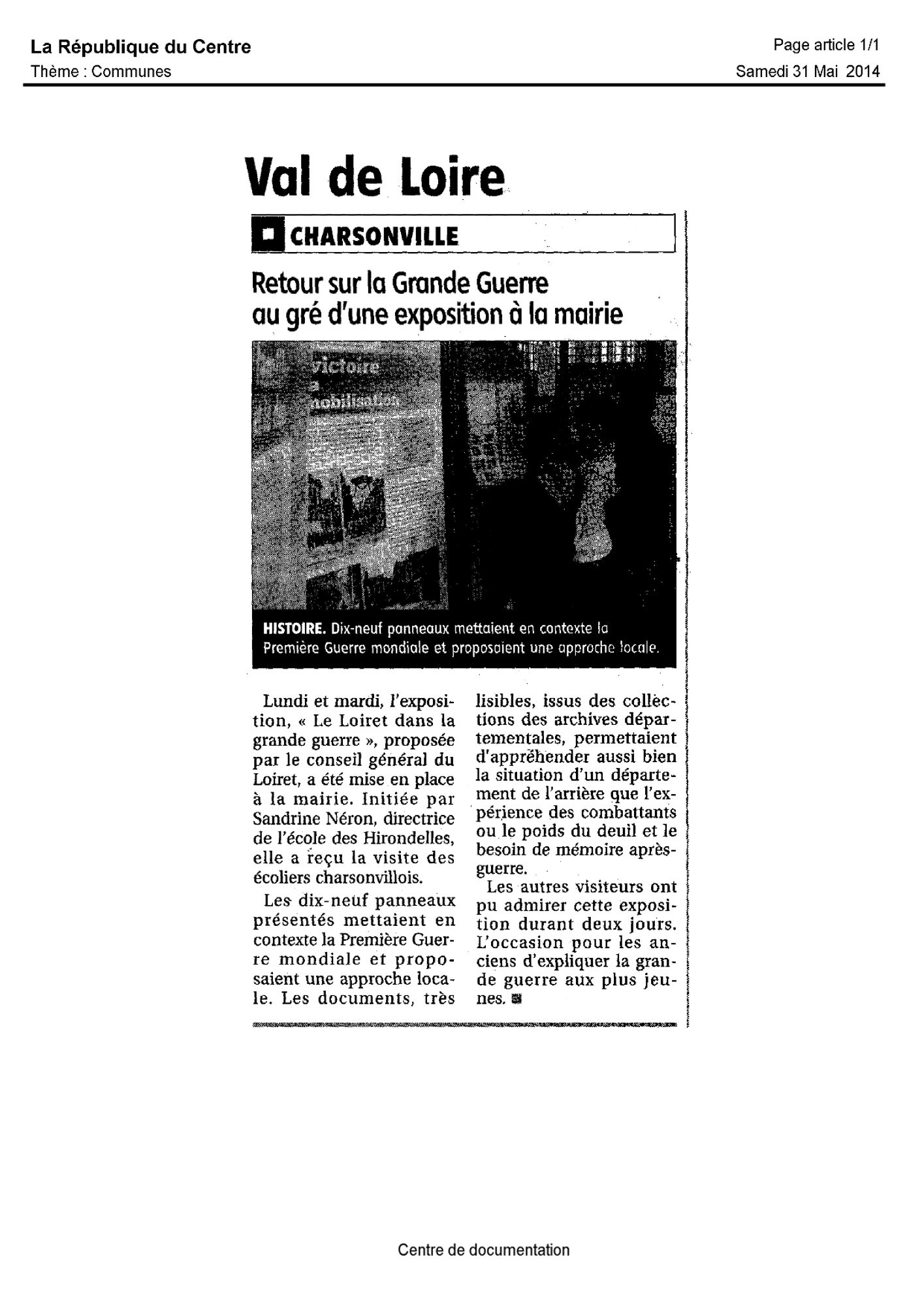 - Le Loiret dans la Grande Guerre : emprunt à l'initiative de l'enseignante dans les locaux de la mairie. Voir l'article ci-dessous paru dans la presse.