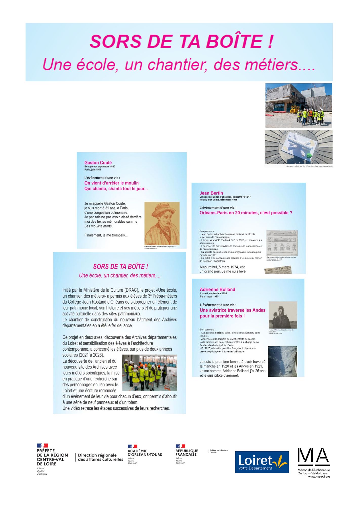 L'exposition réalisée dans le cadre du dispositif « Une école, un chantier, des métiers » par les élèves de 3e Pro du collège Jean-Rostand, en partenariat avec la Maison de l’Architecture et du Centre est présentée dans le cadre de l'inauguration du nouveau bâtiment des Archives départementales.