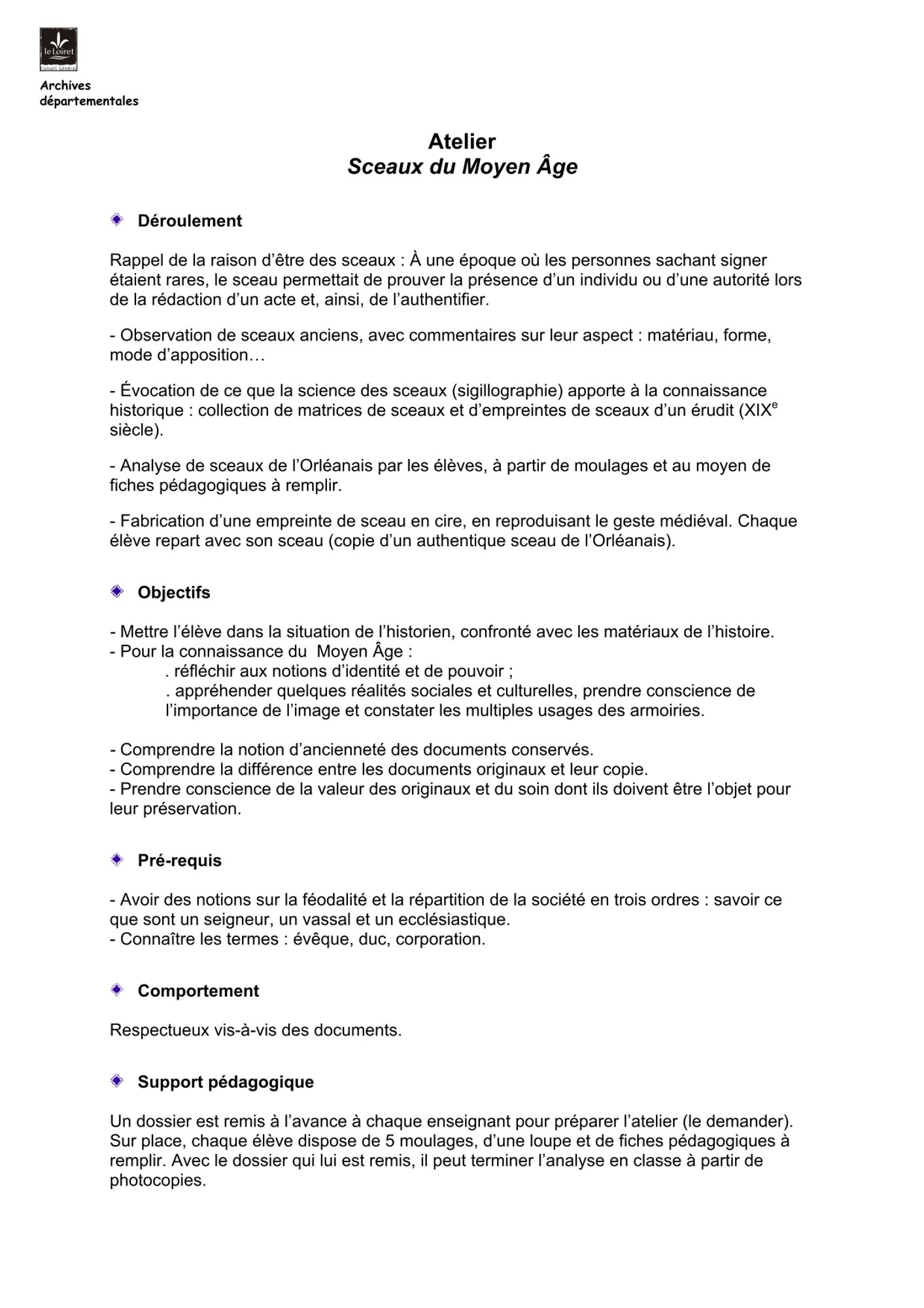 A partir d'une copie de matrice de sceaux, les élèves pourront, par petits groupes, confectionner un sceau en pâte malléable, en reproduisant le geste médiéval. Chacun repart avec le dossier qu'il a complété et le sceau qu'il a fabriqué.