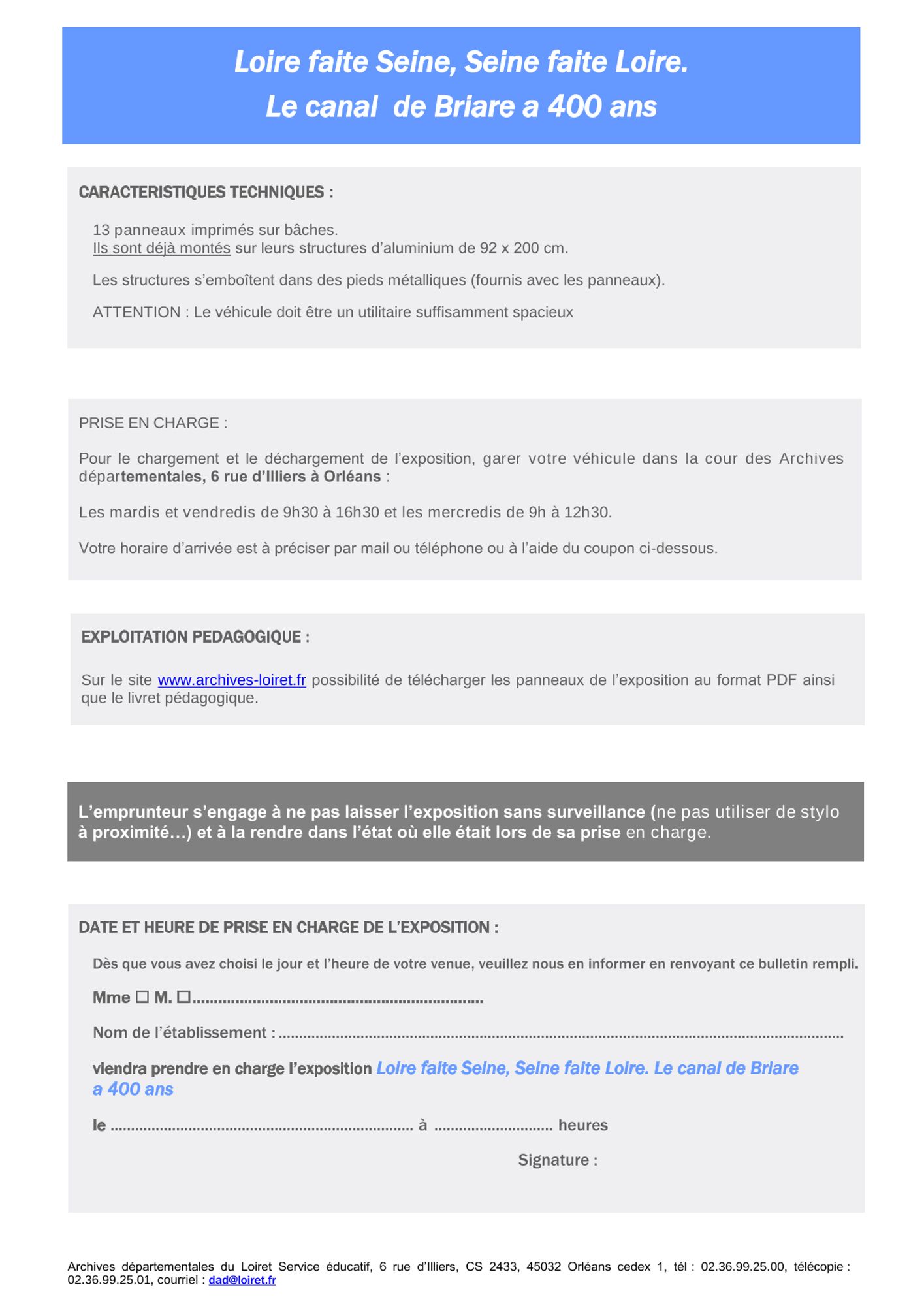 Le prêt est gratuit, la prise en charge et le retour des panneaux sont effectués par l'emprunteur.