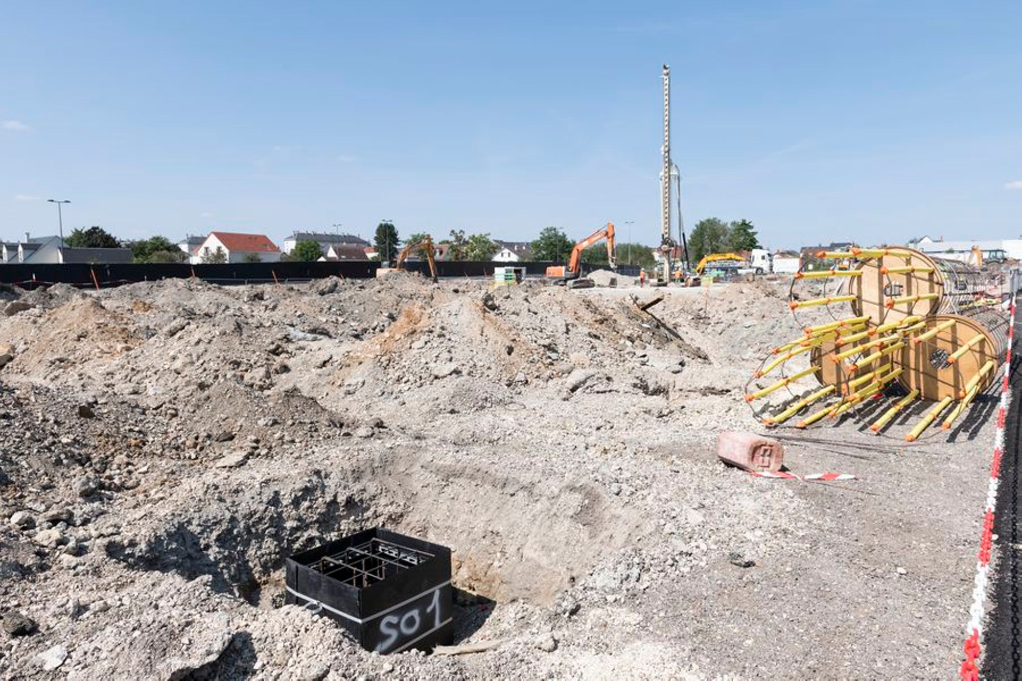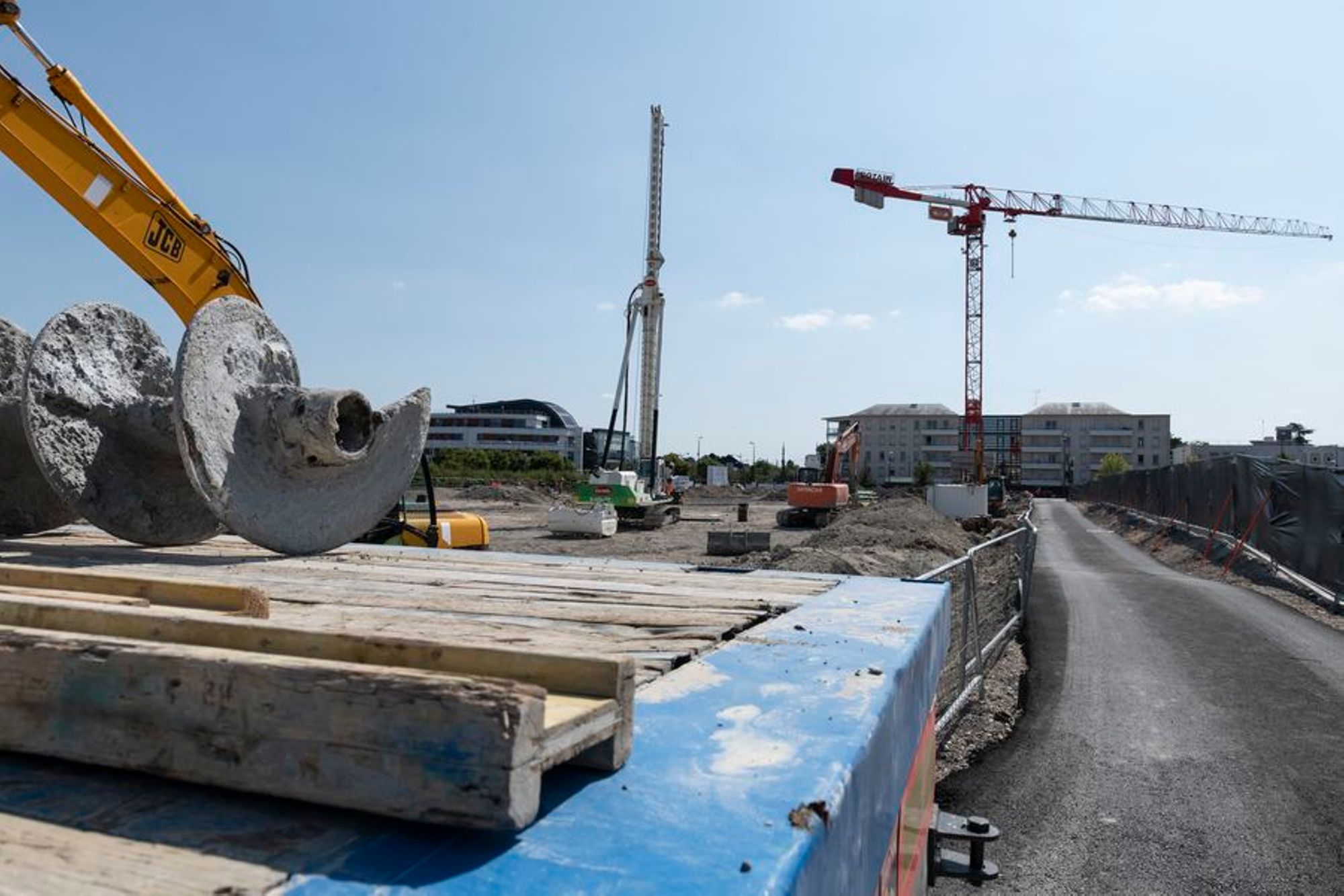 La première grue vient d'être installée. Nécessaire pour déplacer aisément les matériaux sur l'ensemble du chantier, elle signale désormais de loin le chantier dans le quartier. Les travaux sur les fondations ont également débuté : forage puis mise en place des premiers pieux de fondation.