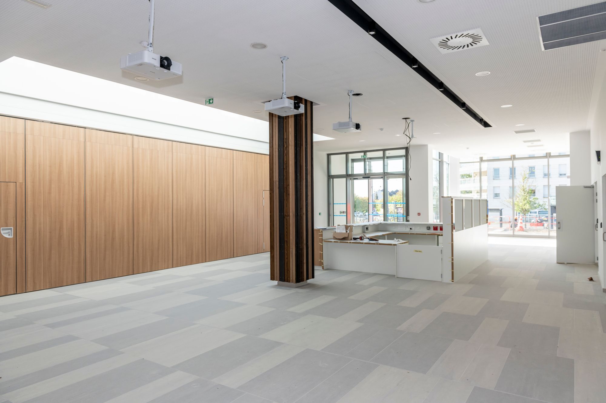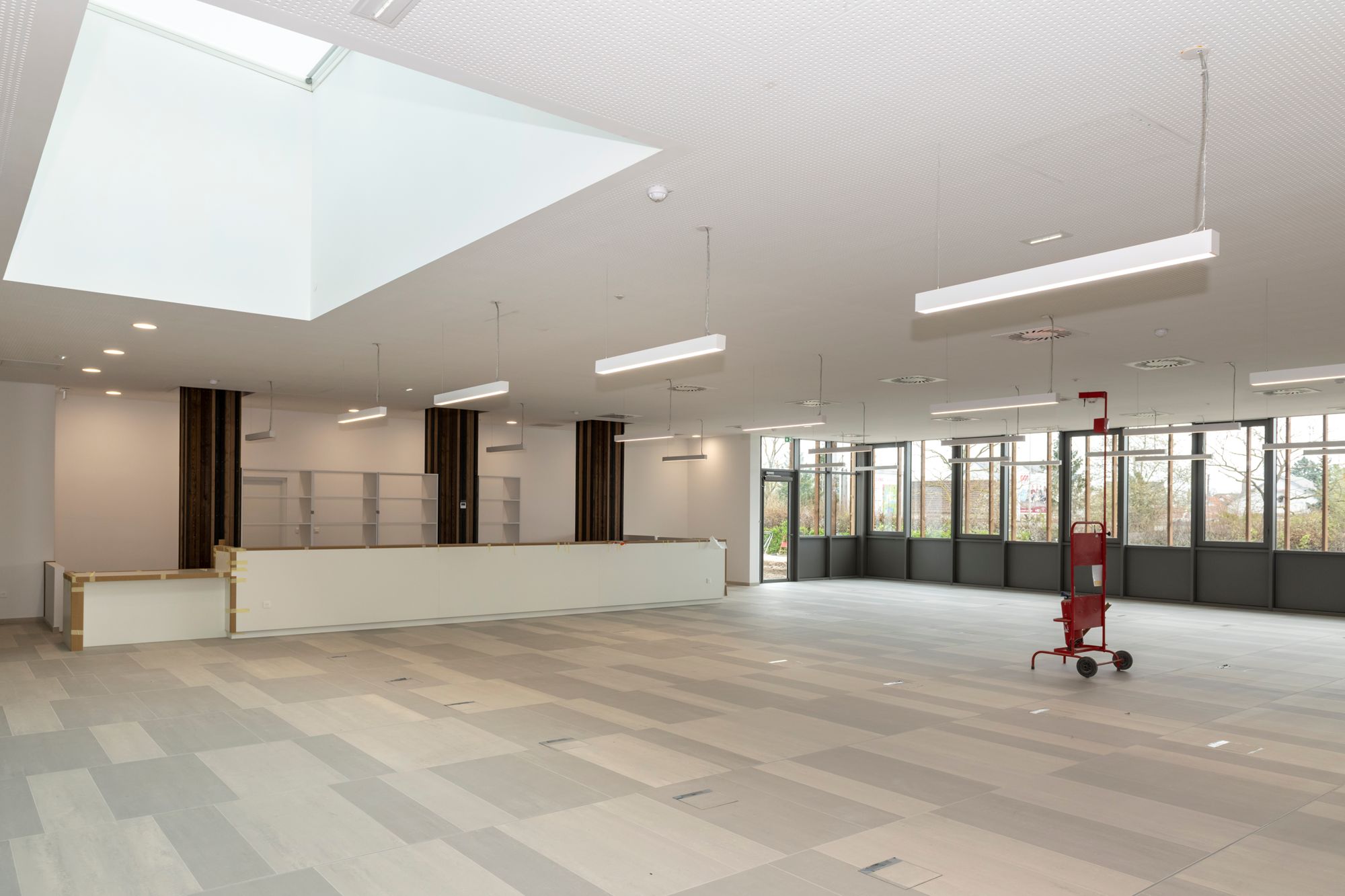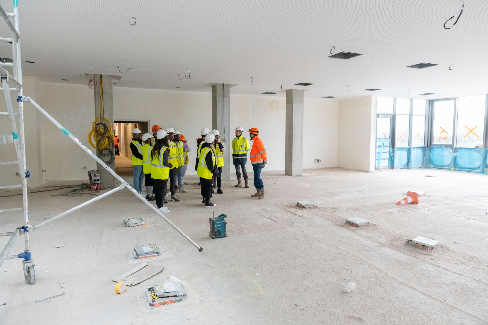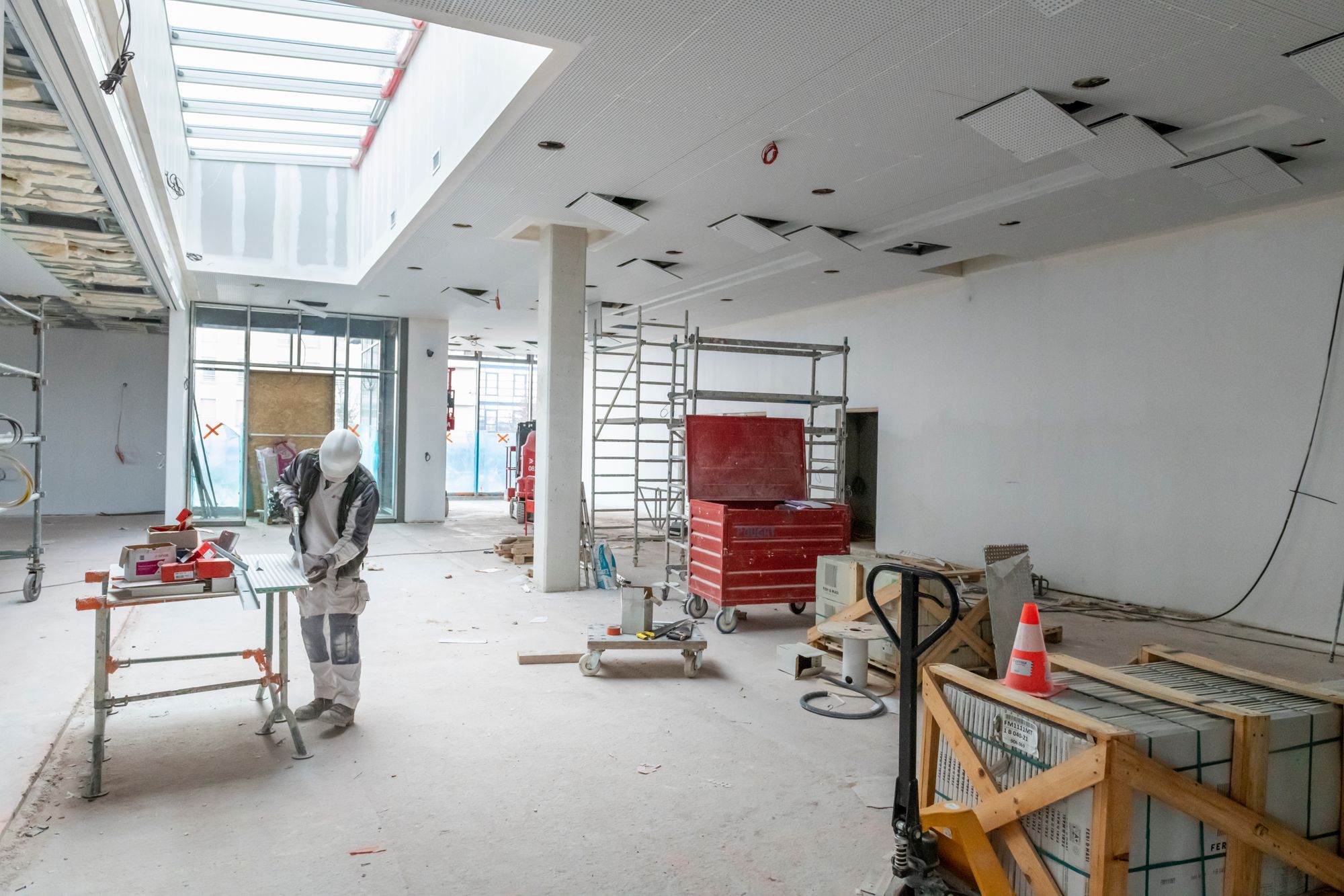 Le chantier avance vite : le 5e étage sera bientôt complètement monté, et la pose du vitrage et des réseaux d’air, d’eau et d’électricité a débuté. La zone des publics au rez-de-chaussée, notamment la salle de conférence et la salle de lecture, commence à prendre forme !