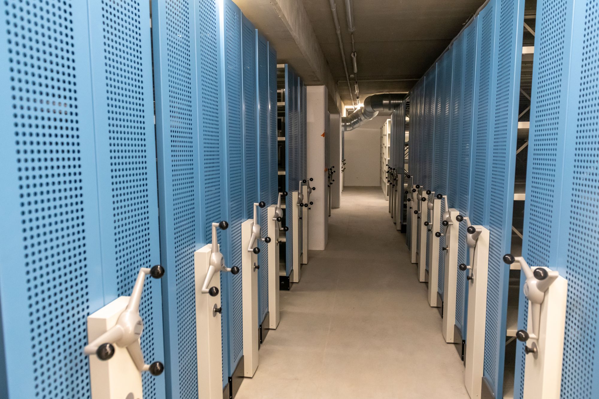 L'isolation et les revêtements extérieurs sont bientôt terminés. A l’intérieur, les espaces d'accueil des publics prennent forme et les magasins d’archives commencent à être équipés de leurs 60 km de rayonnages, fixes ou mobiles.