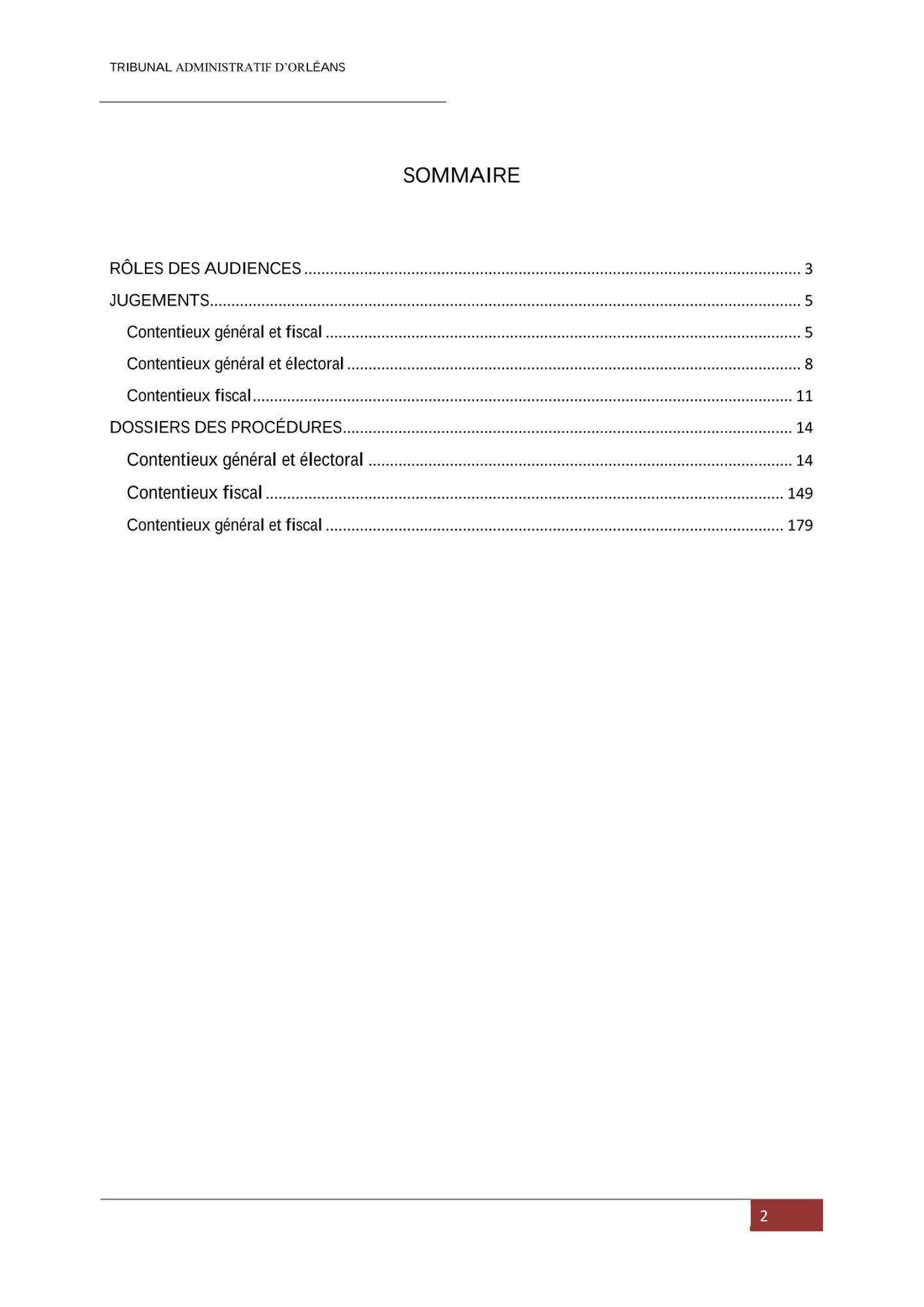 Les dossiers des procédures sont présentés dans l’ordre chronologique, tous départements confondus. Jusqu’en 1969, l’objet du contentieux et les noms des parties sont indiqués pour l’intégralité des affaires ainsi que les dates extrêmes des documents, sans mention de la date d’audience précise. À compter de 1970 et jusqu’en 2004, seules les dates des audiences sont indiquées, celles-ci correspondant aux dates des jugements ou des ordonnances de référé du tribunal administratif d’Orléans.