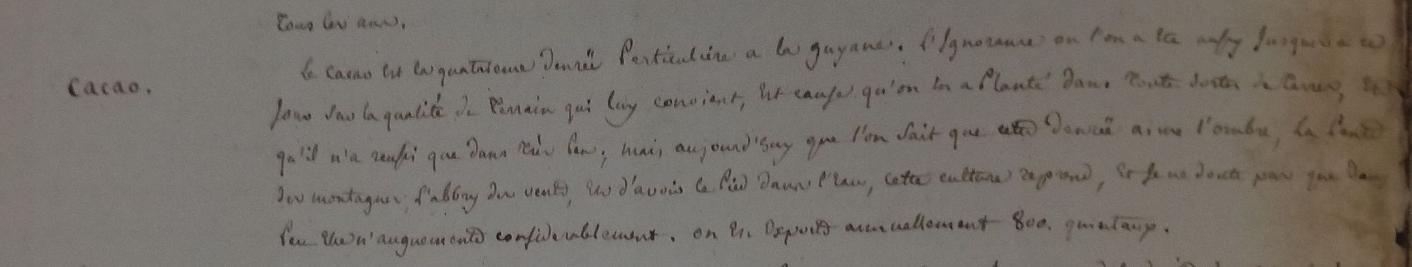 Les premiers chocolats arrivent à la cour de France lors du mariage de Louis XIII avec Anne d’Autriche en 1615. Ils sont alors consommés sous forme de boissons. Cette denrée est à l’époque considérée comme luxueuse, et son importation est récente pour des européens qui n’ont découvert le nouveau monde qu’un siècle plus tôt. Dans la Mémoire sur la Guyane française datée de 1775, l’intendant des colonies et ordonnateur à Cayenne César Jacques Delacroix décrit l’avancée des connaissances sur la culture de ces fèves : « Le cacao est la quatrième denrée particulière à la Guyane…. mais aujourd’huy que l’on sait que cette denrée aime l’ombre, la pente des montagnes, l’abbry du vent, et d’avoir les pieds dans l’eau, cette culture reprend… On en espère annuellement 800 quintaux ». « Planté dans toute sorte de terre », le cacao est encore, un siècle et demi après le mariage de Louis XIII et Anne d’Autriche, une culture expérimentale qui n’a pas révélé tous ses secrets !