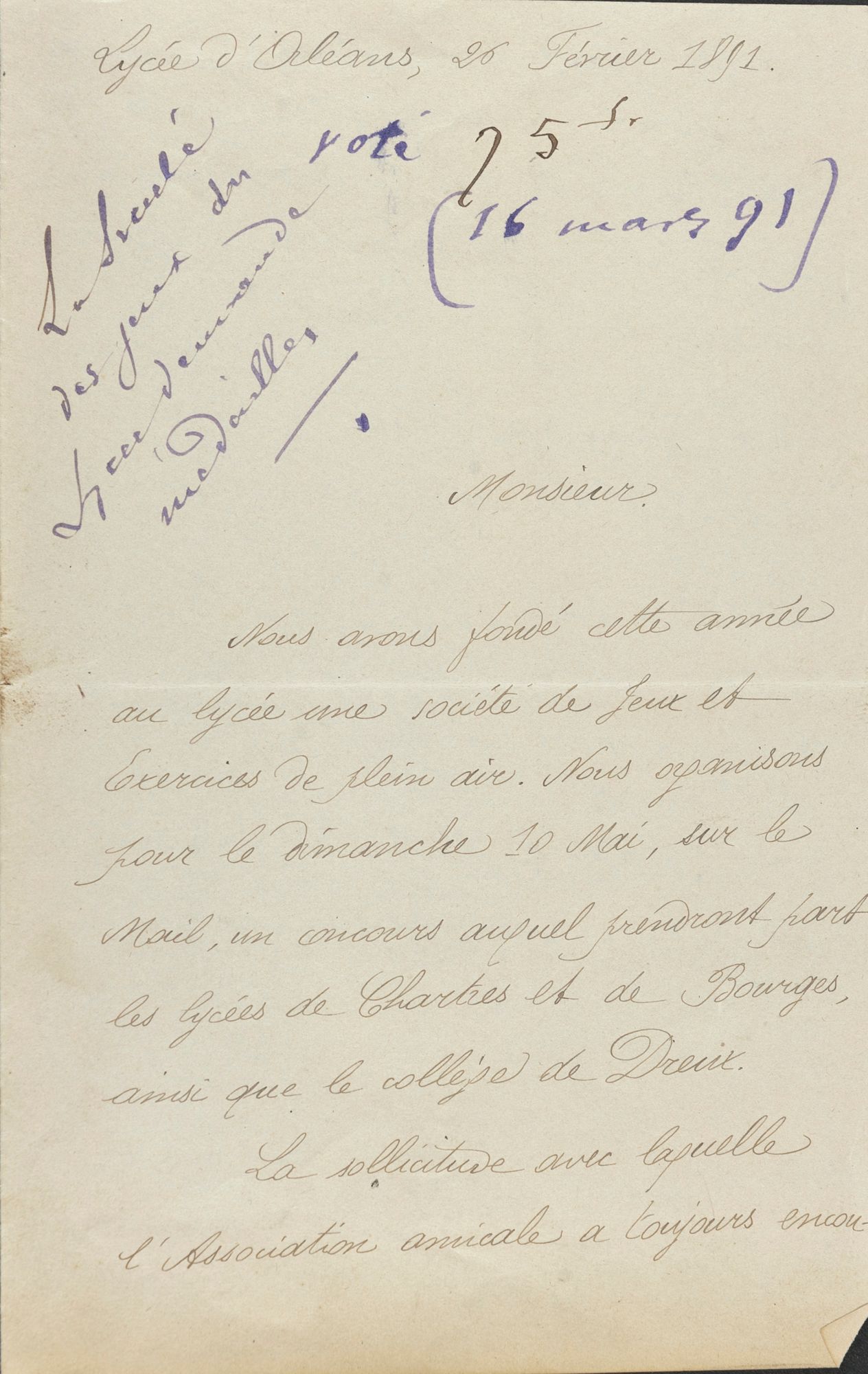 (Arch. dép. du Loiret, Fonds de l'Association amicale des Anciens Elèves du Lycée d'Orléans, 498 J 2)