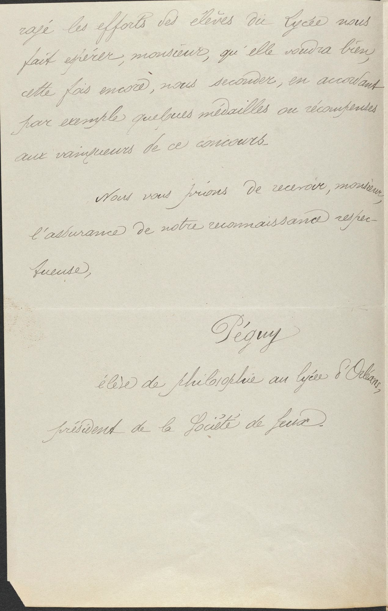 Importé d’Angleterre, le rugby apparaît vers 1885 dans les lycées et collèges du département, où des équipes se forment pour disputer des matchs amicaux. Au lycée d’Orléans (devenu lycée Pothier en 1924), un certain Charles Péguy, élève en philosophie encore méconnu, est un adepte enthousiaste de ce sport ! Engagé dans la vie de son école, il y est président de la société de jeux de plein air. Le 10 mai 1891, un concours sportif est organisé sur le Mail (à l’emplacement actuel du boulevard Rocheplatte). Ces sports athlétiques, dont le rugby, voient alors s’affronter les lycées d’Orléans, Chartres et Bourges, ainsi que le collège de Dreux. Afin de récompenser les vainqueurs, Charles Péguy n’hésite pas à écrire au président du comité d’administration de son école, un certain Monsieur Anatole Dubec, pour réclamer des médailles ou des récompenses. Après un vote, Il obtiendra 75 francs. Nul ne sait comment sera finalement répartie cette somme entre les vainqueurs.