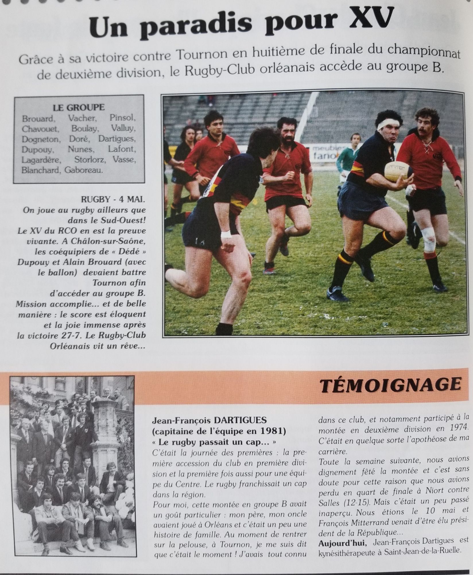 Le Rugby-Club orléanais accéda à l’élite de ce sport en 1981. Jean-François Dartigues, joueur de cette équipe, témoigne de cette épopée dans l’article ci-dessous :