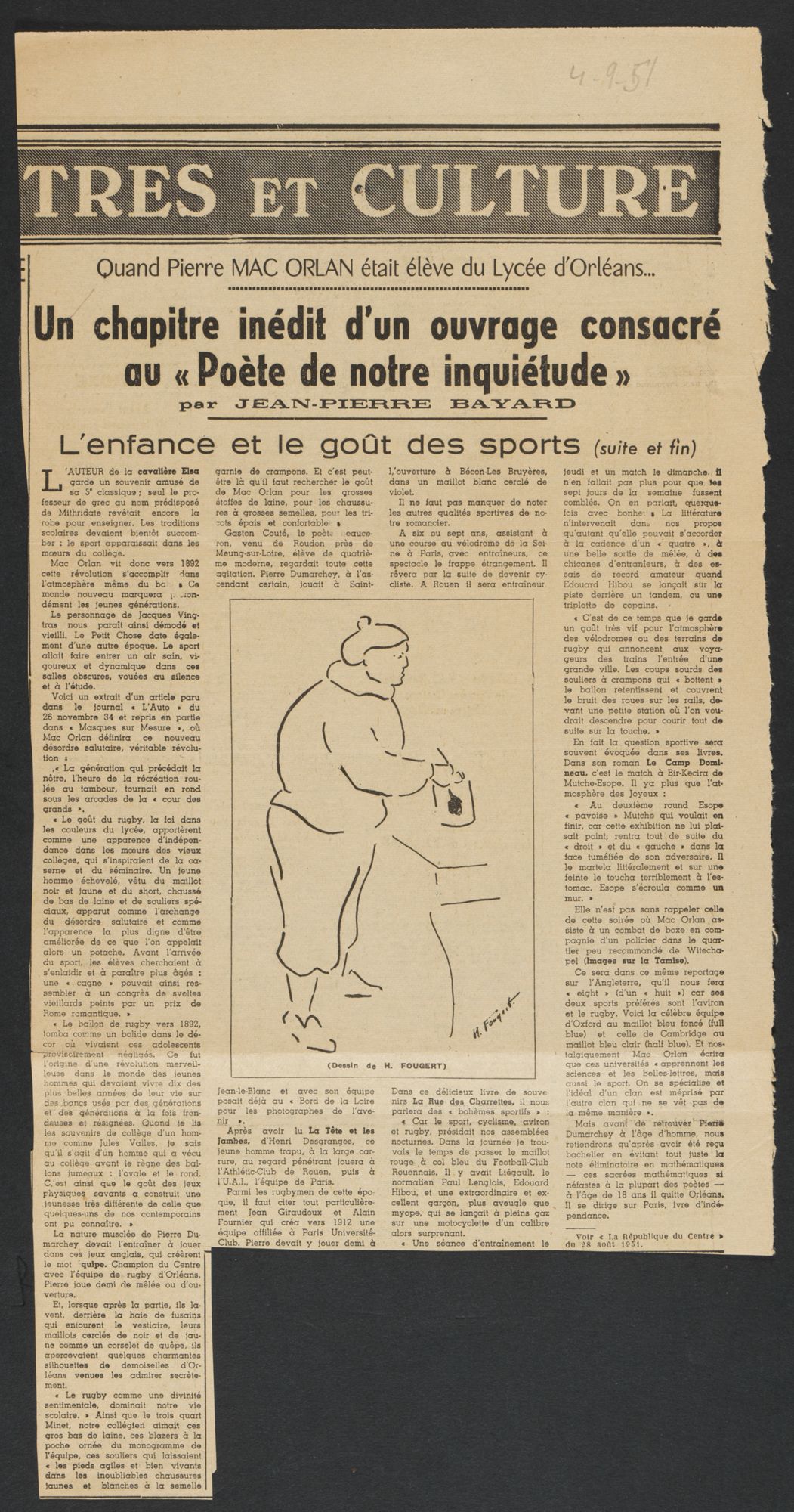 Article de journal consacré à Pierre Mac Orlan et à sa passion pour le rugby, [année 1950).