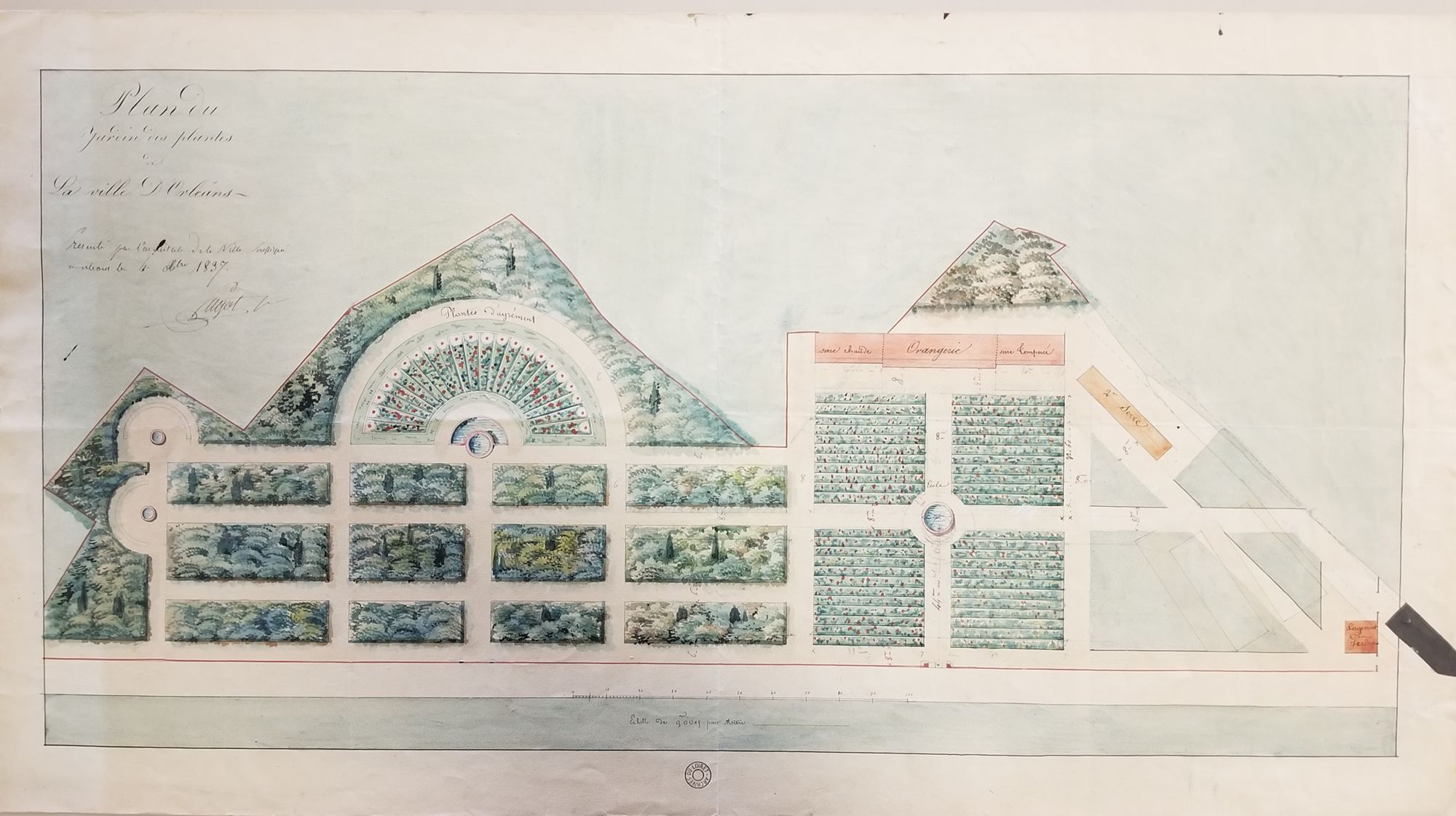 N’avez-vous jamais eu envie de vous perdre dans un jardin de roses ? Ce plan en couleurs daté de 1837 pourrait vous y encourager ! Il présente le jardin des plantes de la ville d’Orléans à ses débuts. À cette époque, il n’y avait pas de roseraie. Ce n’est qu’en 1958 que cette dernière voit le jour pour servir de cadre au tout nouveau Concours de Roses. Le nombre de roses présentées y est alors impressionnant : 7 500 rosiers représentant près de 400 variétés. Une pergola, qui existe toujours, marquait l’entrée de ce lieu coloré.
