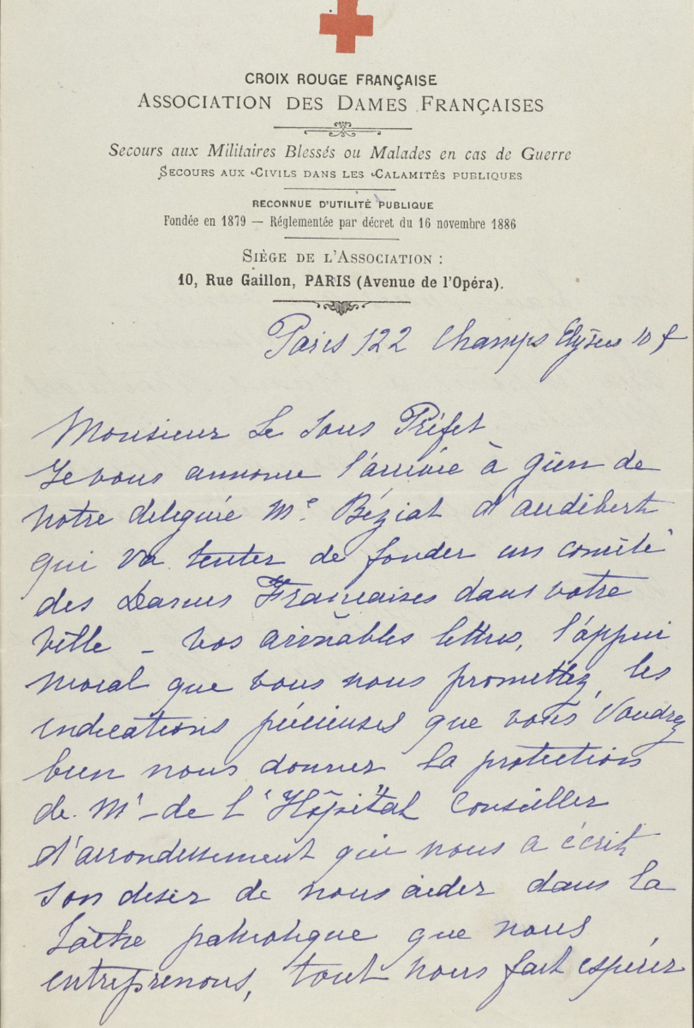 En 1897, l’Association des Dames Françaises (ADF), par l’intermédiaire de sa directrice de la propagande, informe le sous-préfet qu’un comité de cette association est en projet à Gien. Cette association utilise comme emblème la Croix Rouge car elle bénéficie de la reconnaissance du « Mouvement Croix-Rouge ». Elle est née d’un désaccord en 1864 avec la Société française de secours aux blessés militaires. Cette dernière, comme son nom l’indique, prend en charge les militaires mis hors de combat lors des conflits sur le territoire français. Le but premier de l’Association des Dames Françaises est la formation des infirmières. Ses interventions se font principalement auprès des civils, victimes de calamités publiques (choléra, grippe, inondations, incendies, etc.). Elle se charge de l’envoi des denrées alimentaires (vin, lait, conserves) et autres (flanelles, livres, tabac…). Selon ses statuts, depuis 1879, l’association est chargée « d’envoyer des secours de toutes sortes […] aux soldats qui ont combattu pour la sécurité ou pour l’honneur de la France en Tunisie, en Chine, au Tonkin au Dahomey [ancien nom du Bénin], et, en ce moment à Madagascar ». Le ministère de la Guerre demande également à l’ADF de préparer des hôpitaux auxiliaires fixes et des hôpitaux de campagne pour compléter ou remplacer les services sanitaires et « d’amasser, en prévision de la guerre, un matériel de secours aussi parfait que possible et de donner l’instruction aux femmes dévouées et courageuses qui veulent être en état d’aider les médecins et les chirurgiens à sauver nos chers malades ou blessés des armées, dans les terribles éventualités auxquelles la nation entière doit toujours être prête à faire face, si elle veut les éviter ».