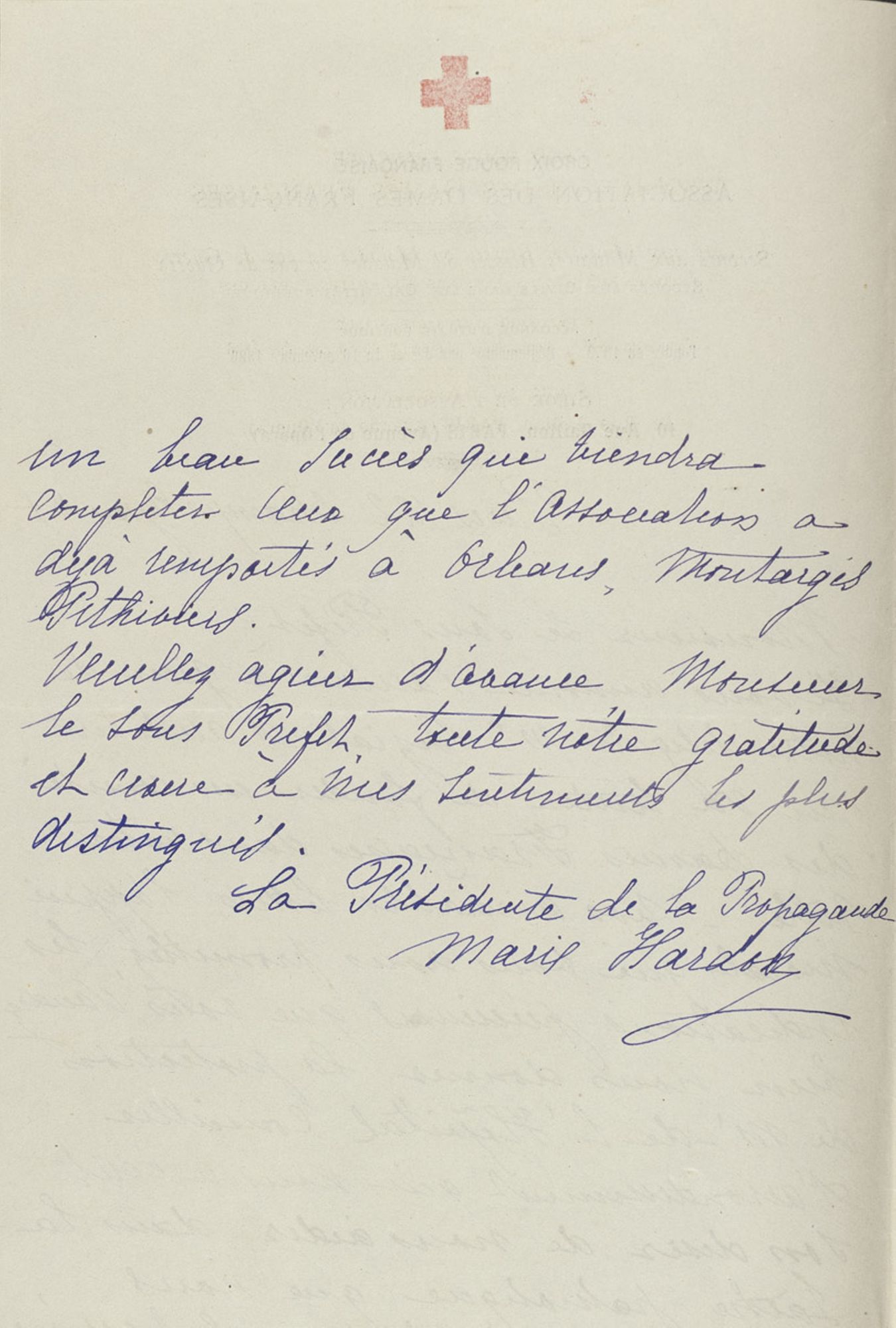 L’objectif de cette association est de couvrir un territoire. Après les comités d’Orléans, Pithiviers et Montargis, l’ADF s’intéresse donc à la ville de Gien. Pour cette création, l’association a besoin de soutiens forts. Dans le courrier, Madame Hardon évoque Monsieur de l’Hôpital, conseiller d’arrondissement (l’arrondissement départemental était une circonscription administrative qui réunissait 9 cantons). L’aide de personnalités locales facilite l’installation matérielle. Ainsi, le comité d’Orléans bénéficie du soutien de Fernand Rabier, député du Loiret et Monsieur Halmagrand, conseiller d’arrondissement.