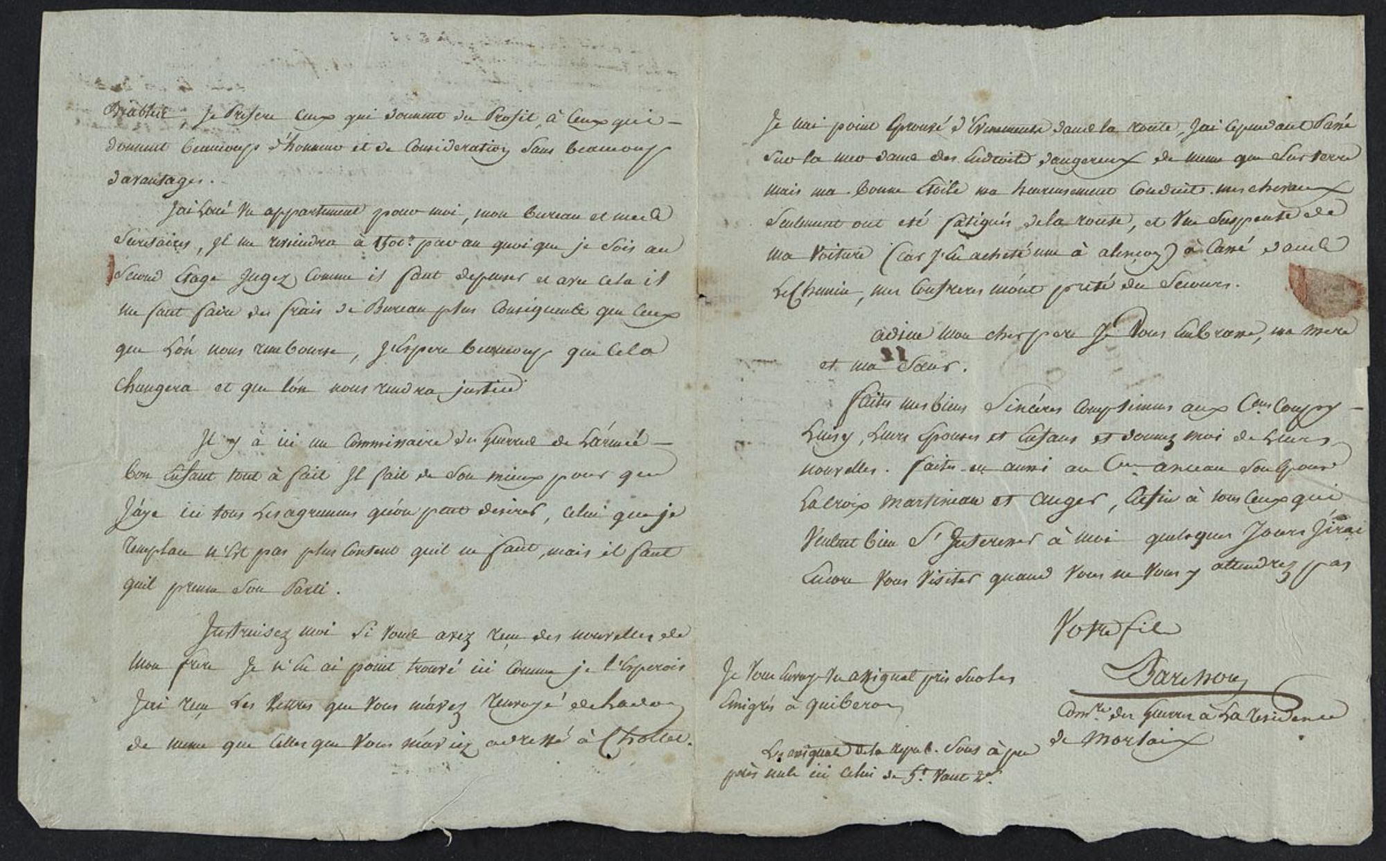 Jean-Hilaire Barchou informe son père de sa récente prise de poste en tant que commissaire de la guerre, donc chargé de l’administration et de l’entretien des armées, à la résidence de Morlaix. Après avoir été en poste à Cholet, au plus près de la zone insurgée des Vendéens, il reconnaît la tranquillité de cette ville du Finistère qui a l’avantage d’être éloignée des Chouans. Ces derniers opéraient approximativement dans un rectangle délimité par Saint-Brieuc et Lorient à l’Ouest, Alençon, le Mans et La Flèche à l’Est.