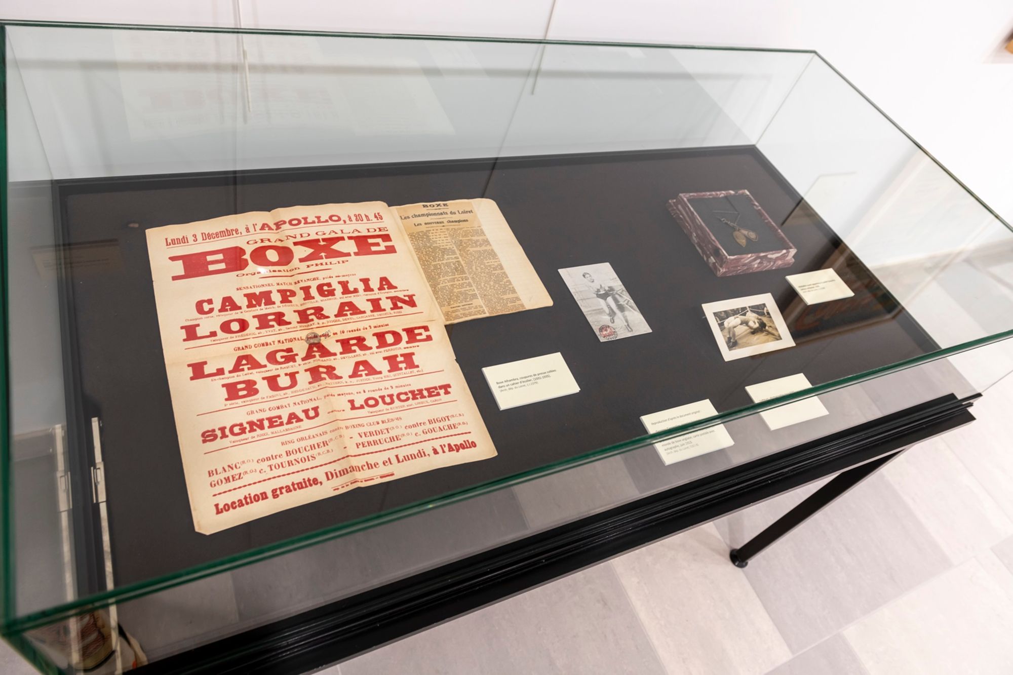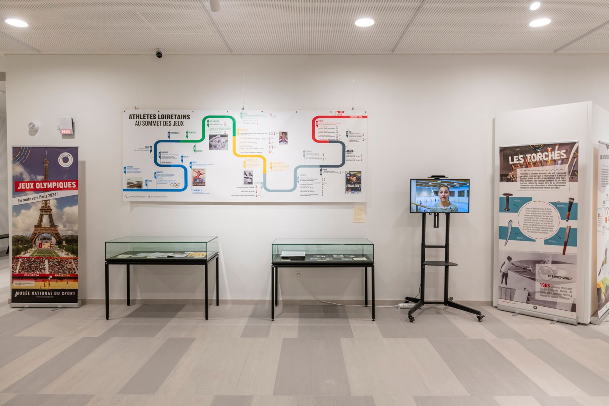 vue de l'exposition Archives dans la course ! Sport et olympisme dans le Loiret, du 21 mai au 30 août 2024, Pavillon Culture, 29 bv Marie-Stuart, Orléans.